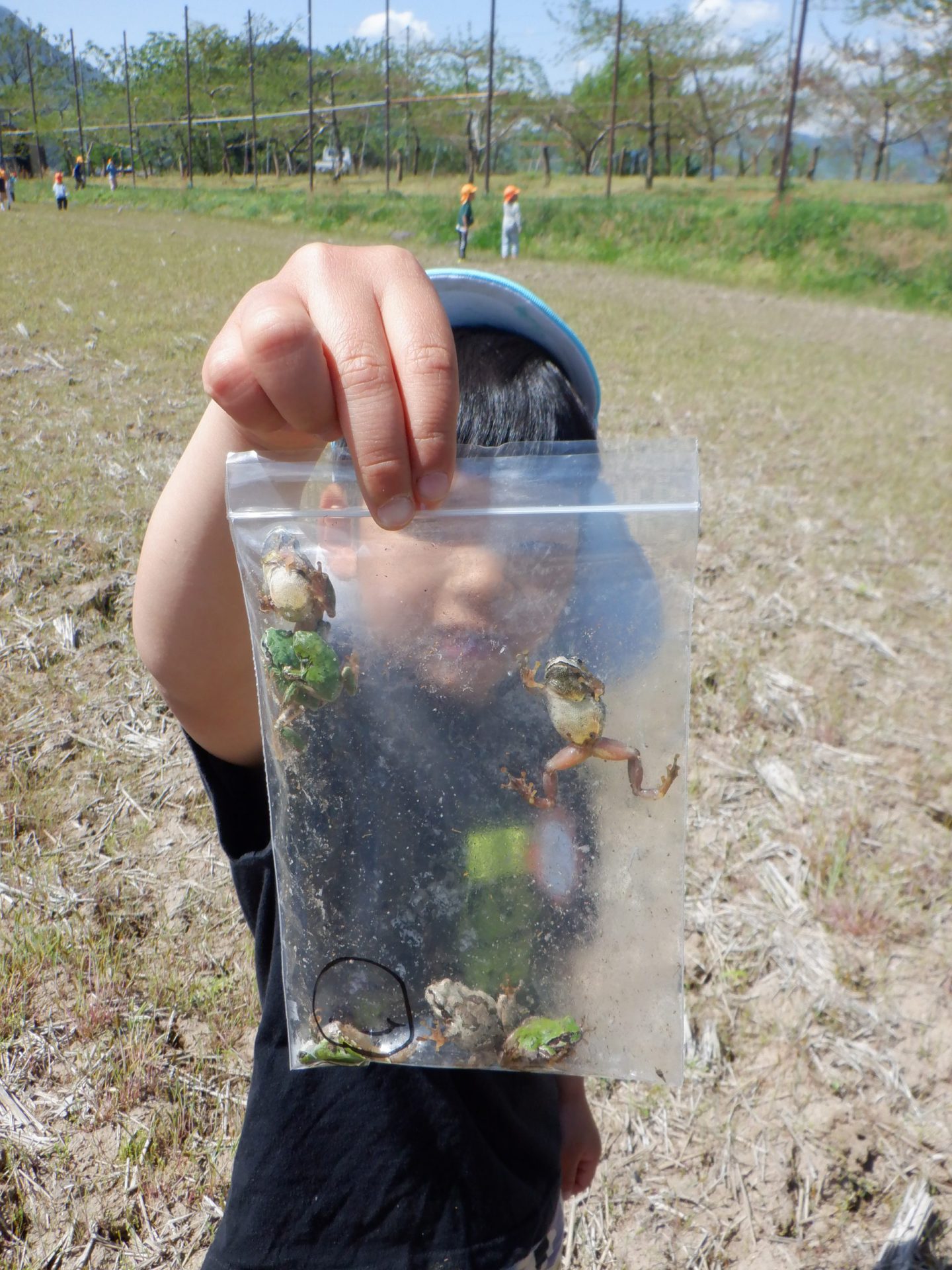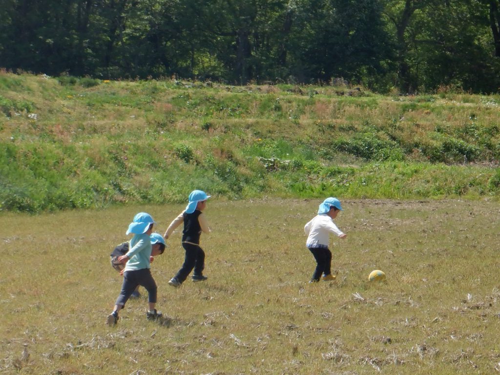 園庭の倍くらい広いからサッカーをしてみたり、カエルなどは園庭でも触れることができるけど、より多く見つけることができたり。初めての試みだったので園庭での遊びからの延長という感じで、園庭との違いという方向で子ども達の気づきが伸びていったように感じました。
