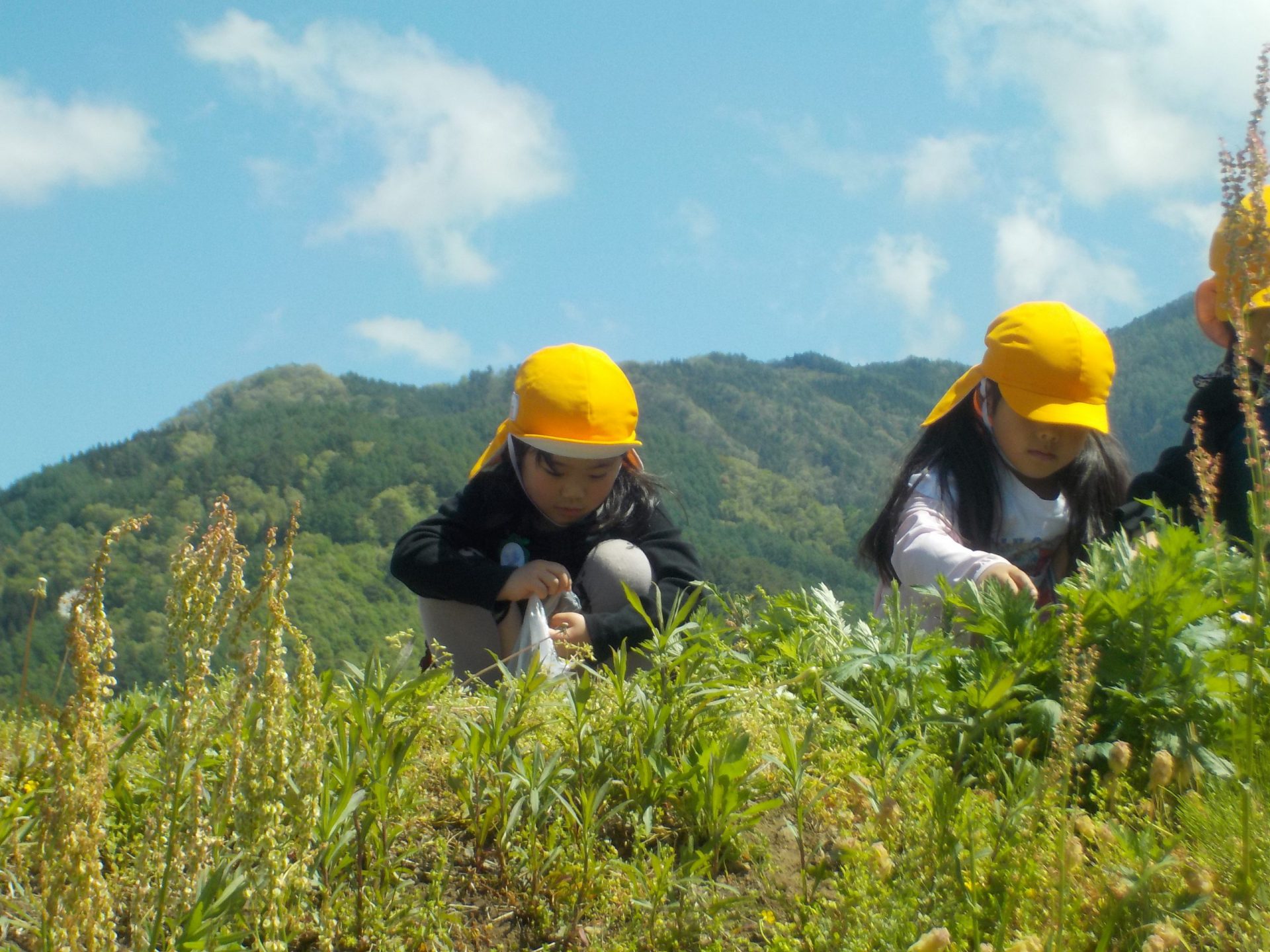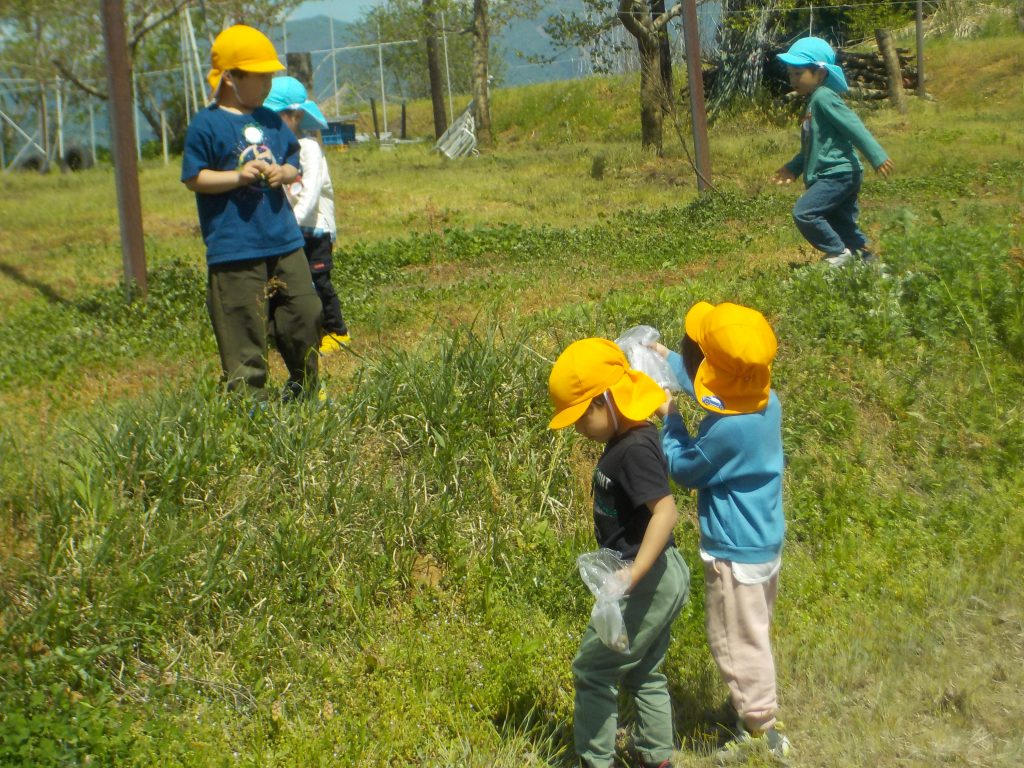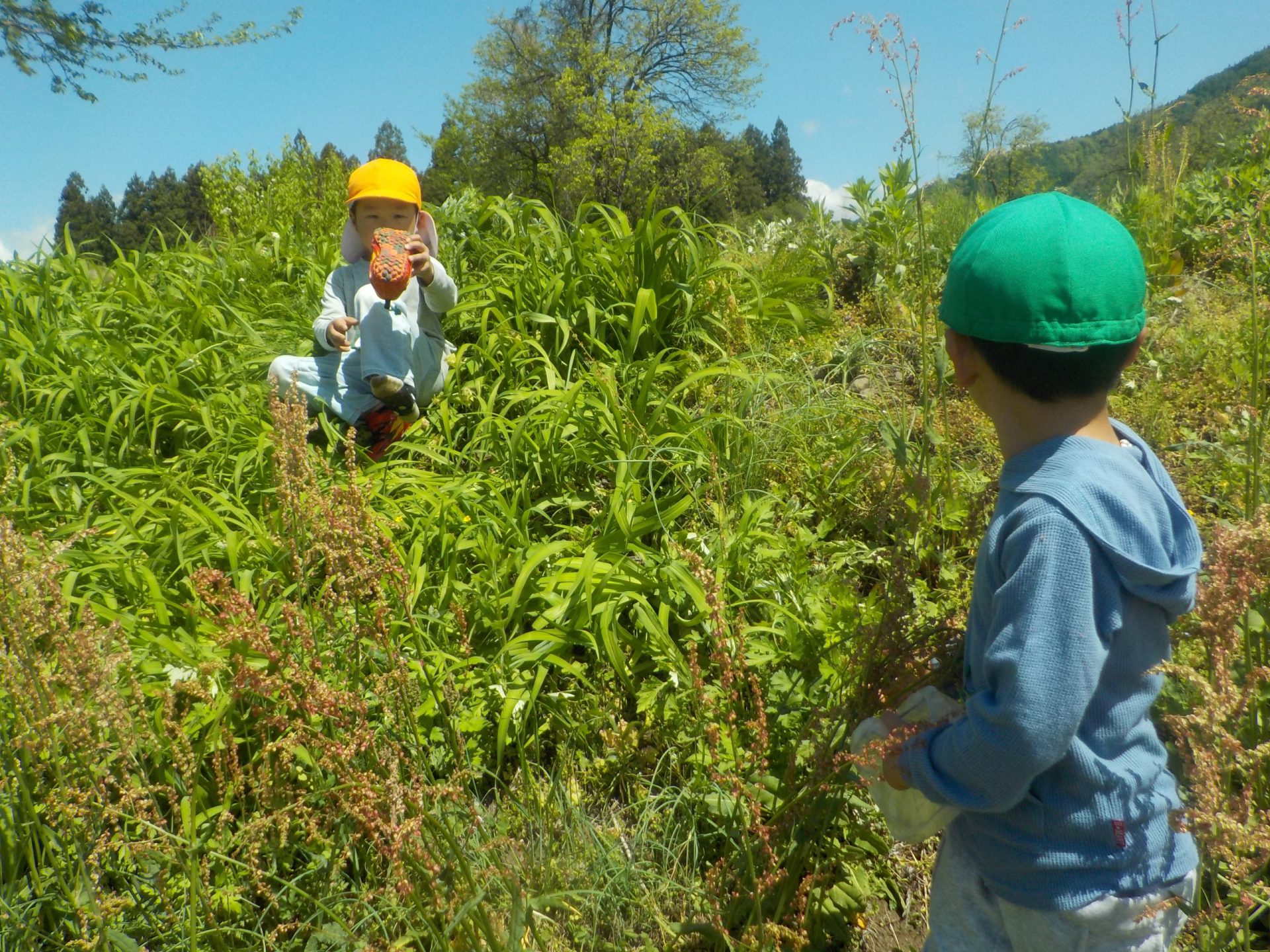 少し前に給食室で使うヨモギを採りに行ったので、今度は持ち帰る用で採っている子が居たり