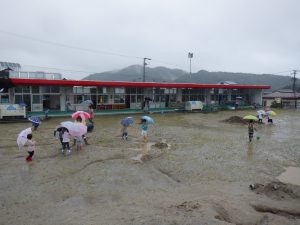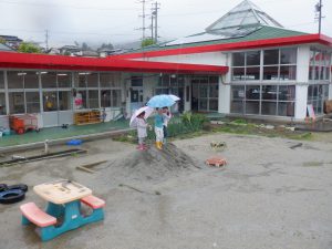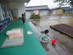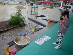 金ダライを置いたことで、屋根から流れ続ける雨やその勢いに関心が増し、自分たちでもやってみたいと感じたようで、自分たちで使えそうな容器を探してきたり、自分で容器を置いてみることで、流れている場所や勢いや容器によって溜り方の違いに気づき、興味も広がっていったのだろう。外の倉庫に容器を探しにいったことで、いつもと違う園庭の様子にも気づき、傘をさして游び始める姿があった。屋根からの滝や園庭にできた山や川など雨の日ならではの発見や面白さを感じ楽しむことができた。