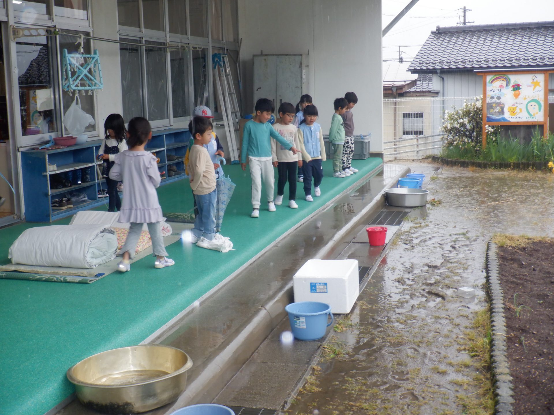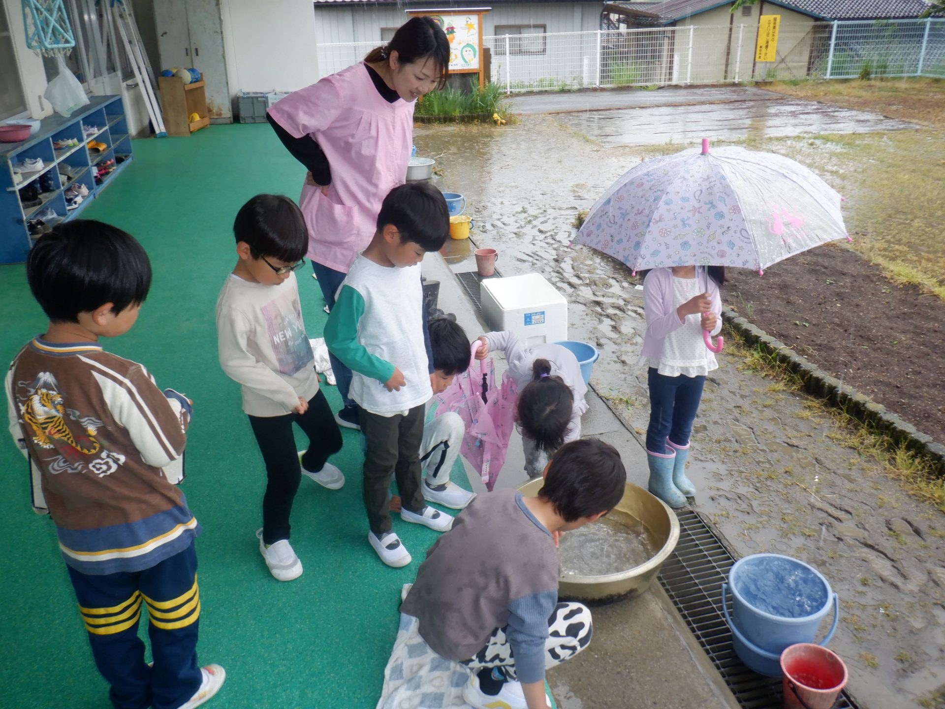 それを見ていた周りのお友だちも次々に水を溜められそうな器を持ってきて置きます。