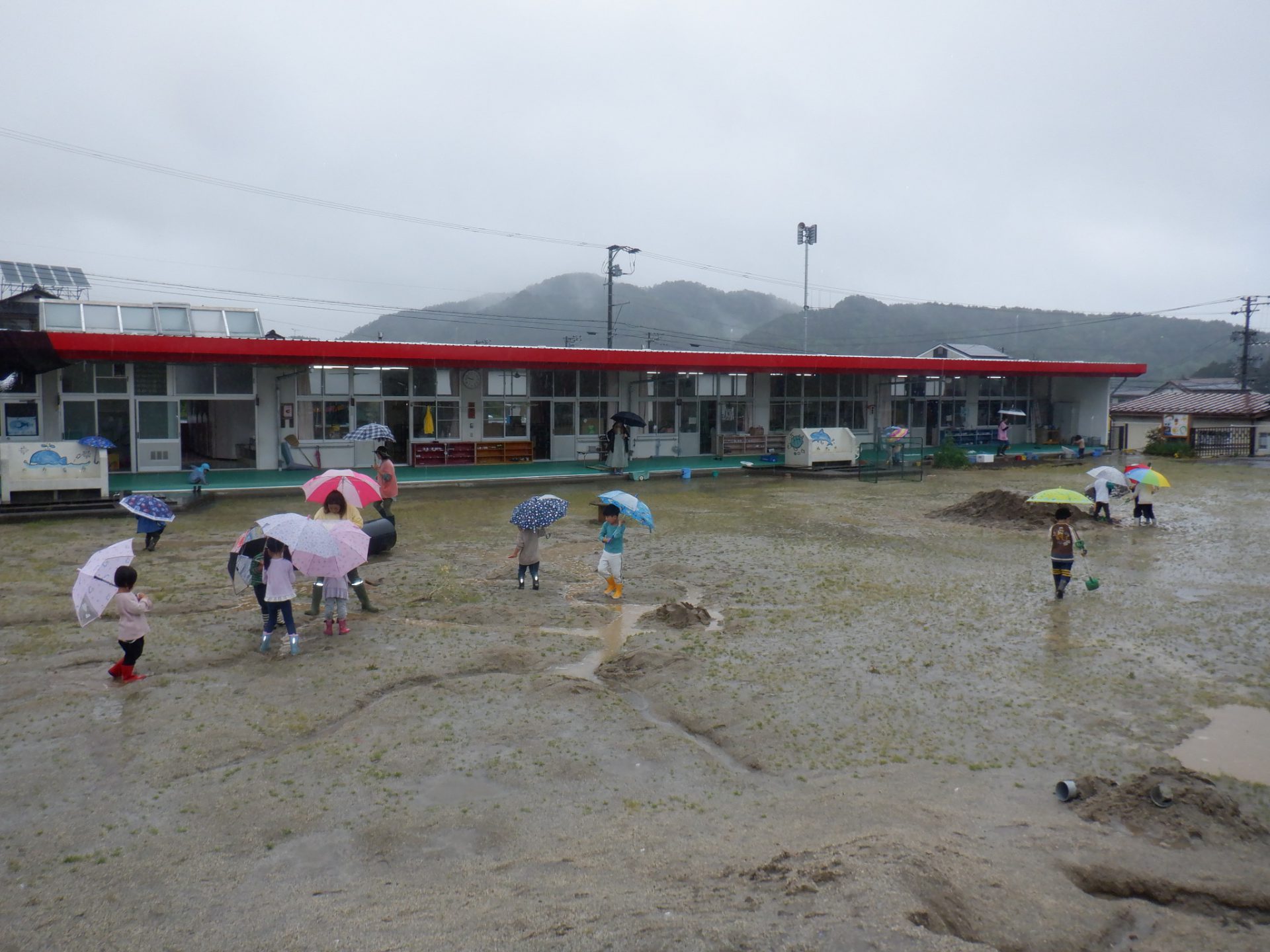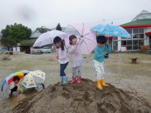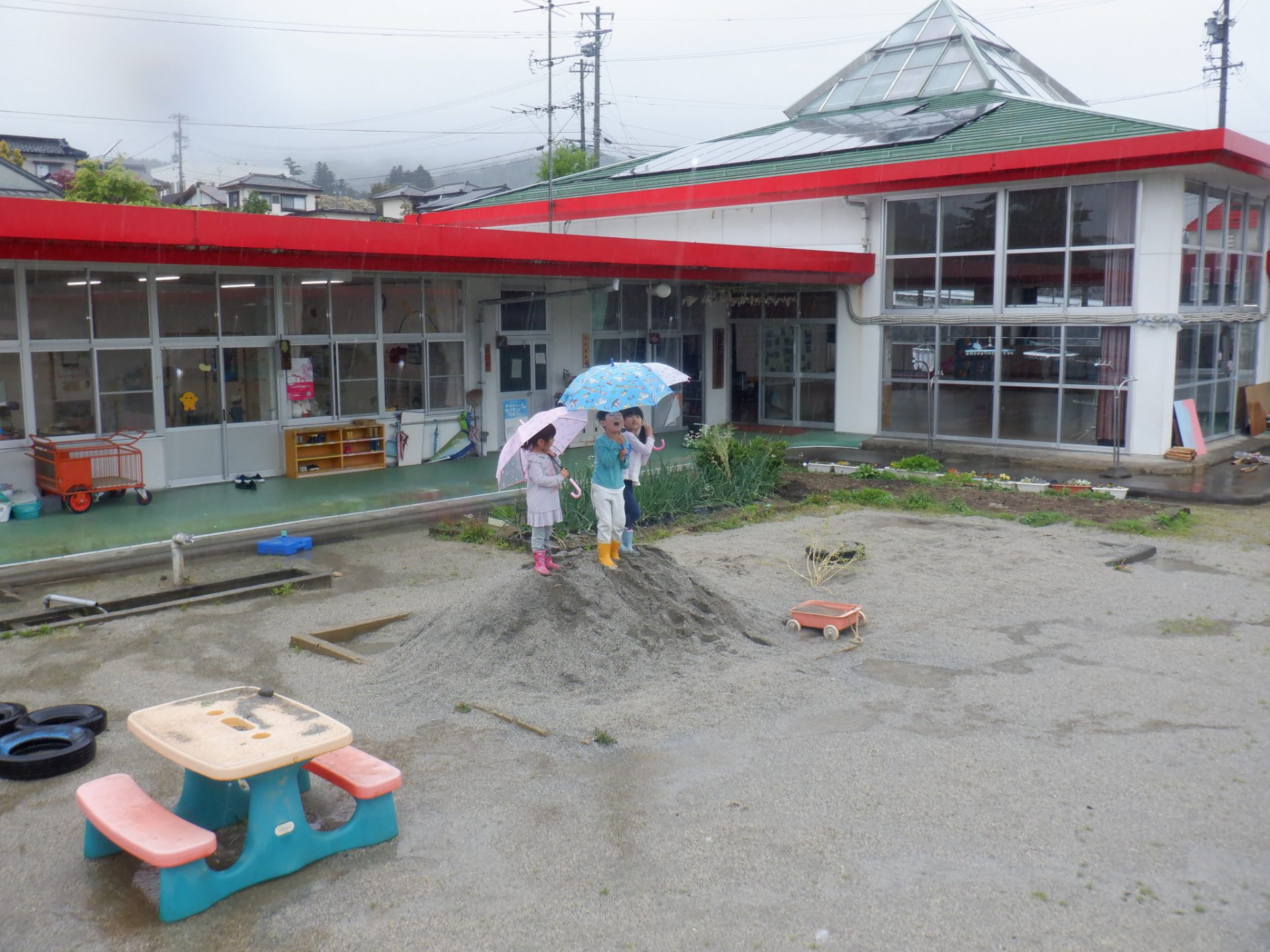 次々に子どもたちが傘をさして園庭に出てきました。 山に登ったり、川の中を歩いてみたりして楽しんでいます。
