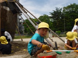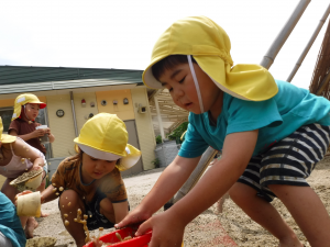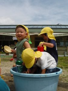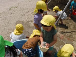この季節にしかできないあそびを全身を使ってたっぷり経験し、水の感触・水と砂を混ぜた時の感触・泥の感触と変化に気づきながら遊びを楽しんでほしいと思います。