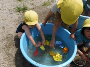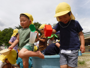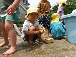 「水あそびするよー!」とタライに水をはると「入りたい!」とよってきた子どもたち。早速入ってみます。