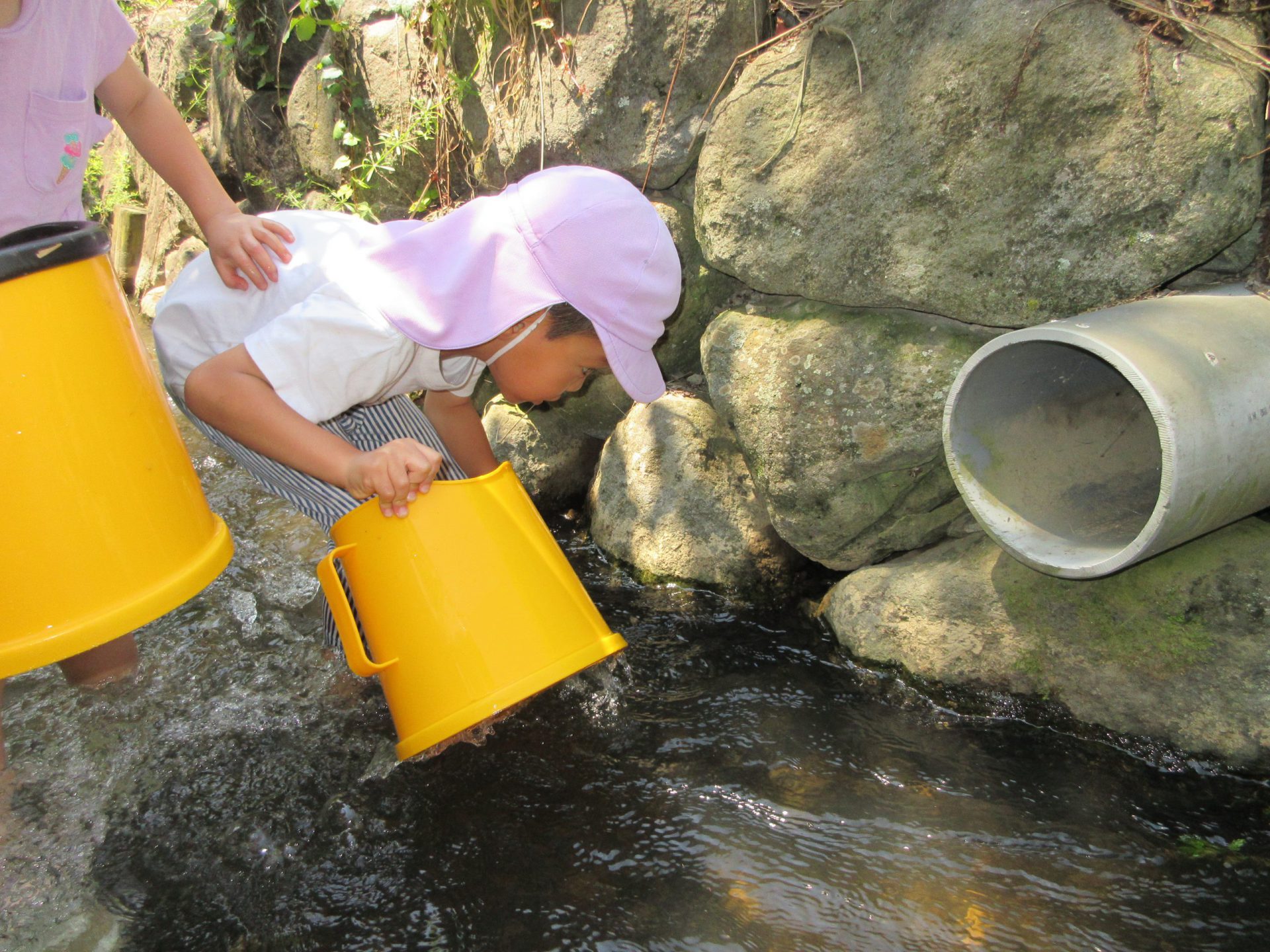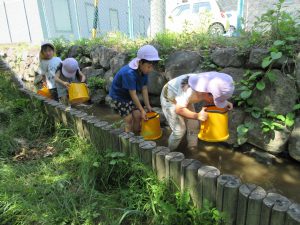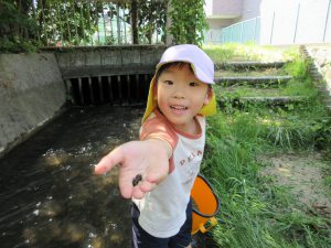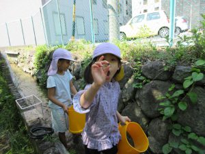 保育園の隣に流れている山王川は、年長さんになったら入れる特別な場所です。入る日を楽しみにしていた子ども達。ようやく水位が低くなってきて入れるようになりました。「カニたくさんとるぞ~!」と勢いよく川へ入っていきます。