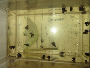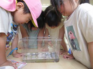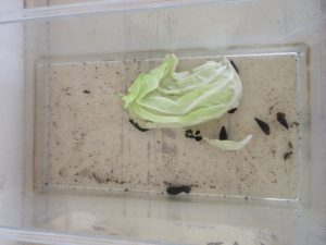 「先生、持ってきたよ!」とお家からキャベツやレタスを持ってきてくれた子ども達。「どっちの方が好きなのかな?」と言うので、キャベツとレタスを同じ大きさに切り、別々の水槽に入れて観察することにしました。