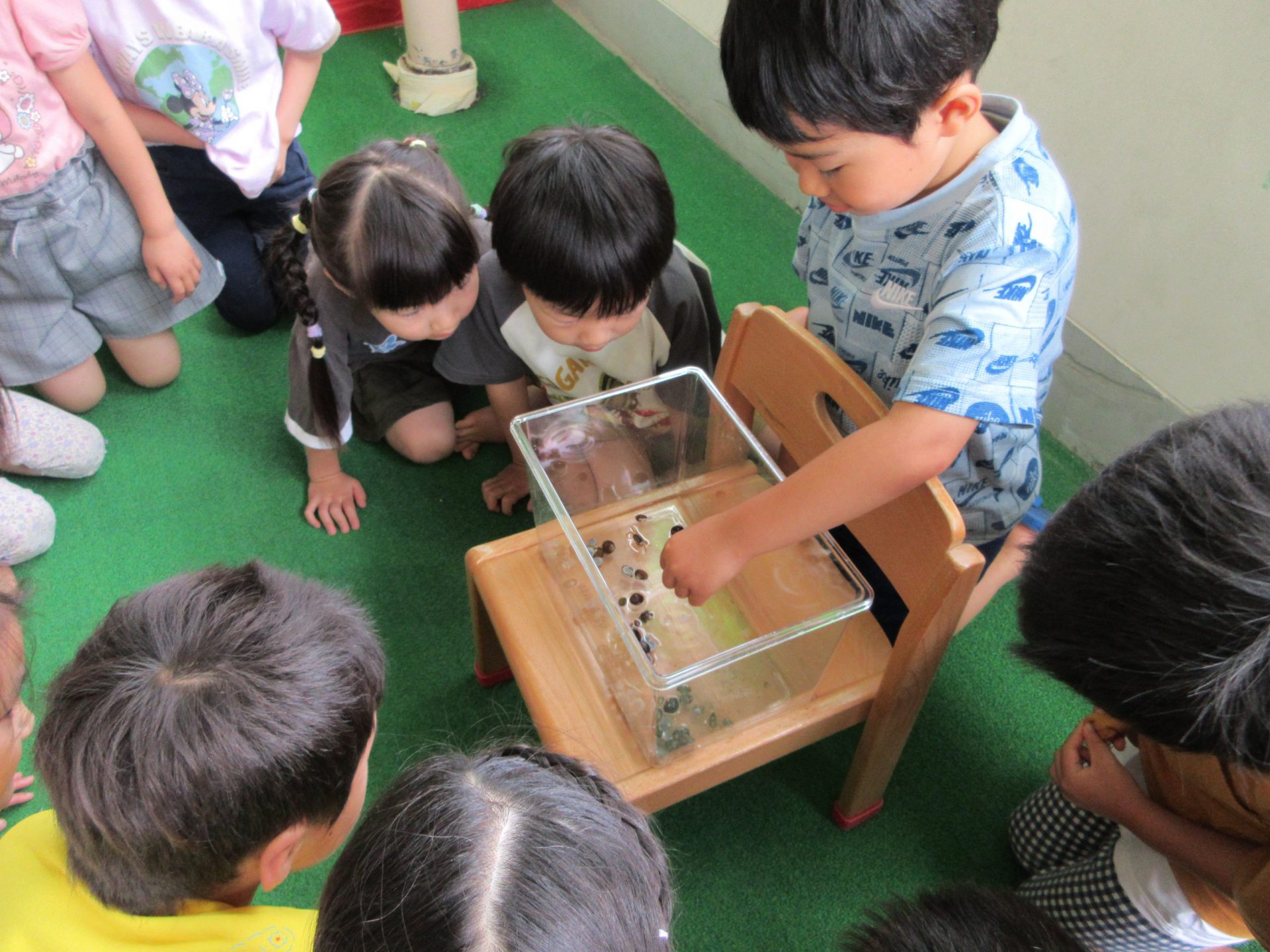 翌朝登園してすぐに水槽の中を確認した子ども達・・・「レタスの方が小さくなってる!!」と発見してみんなで見比べていました。