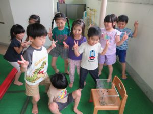 「か~に!か~に!」とカニダンスを始めた子ども達。みんなで水槽の周りを回り始めました。すると・・・「動いた!!」「友達だと思ってくれたかな!?」「そのままご飯のところまで行って~!」とどうにか食べるところを見たくて必死な子ども達でした。