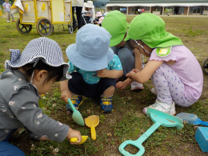 園庭を歩いている途中、遊んでいる途中でも「何だこれ?」と興味のあるものを見つけるとしゃがんで触ったり、、ながめてみたり・・・思いのままに動いています。