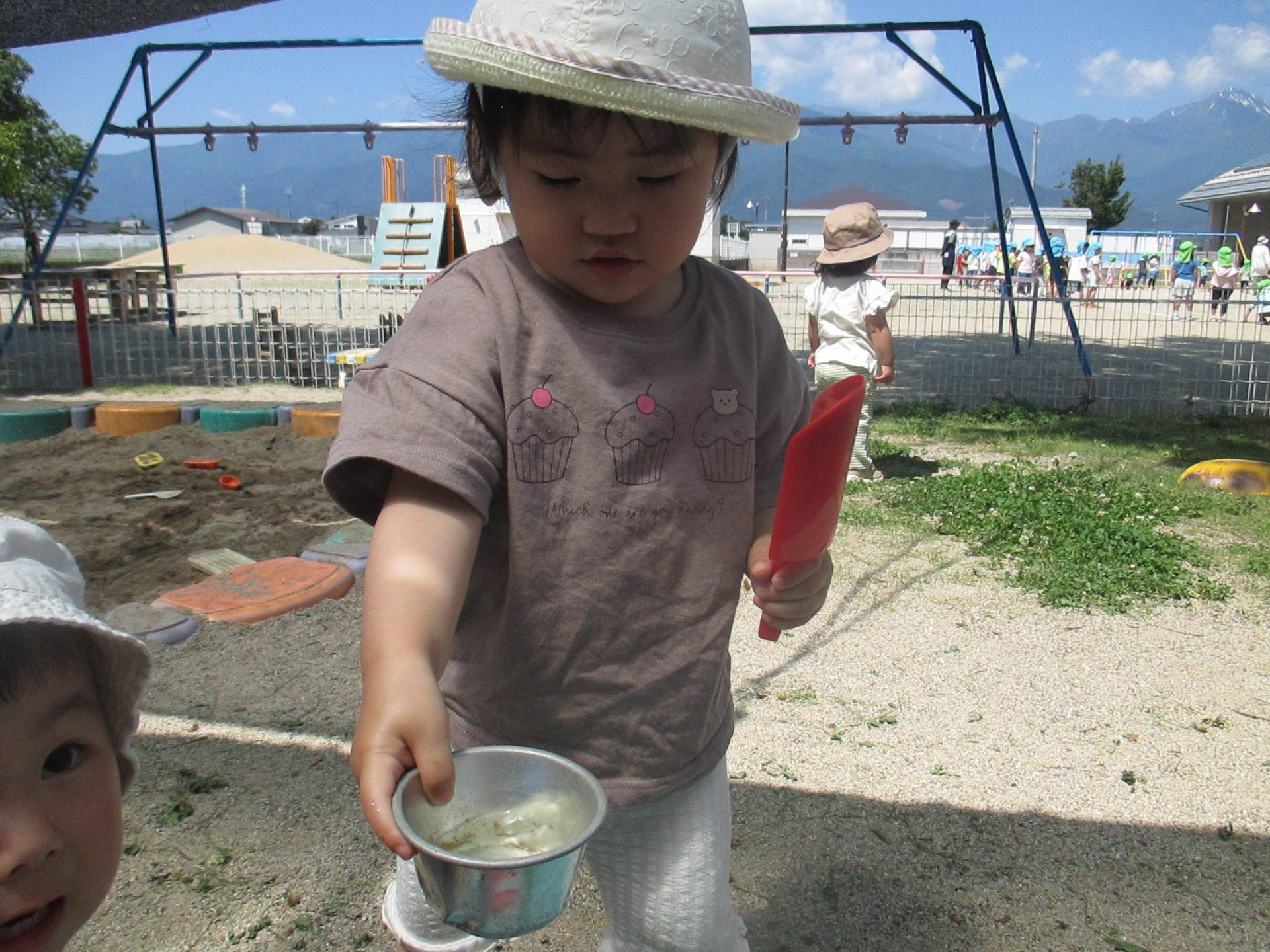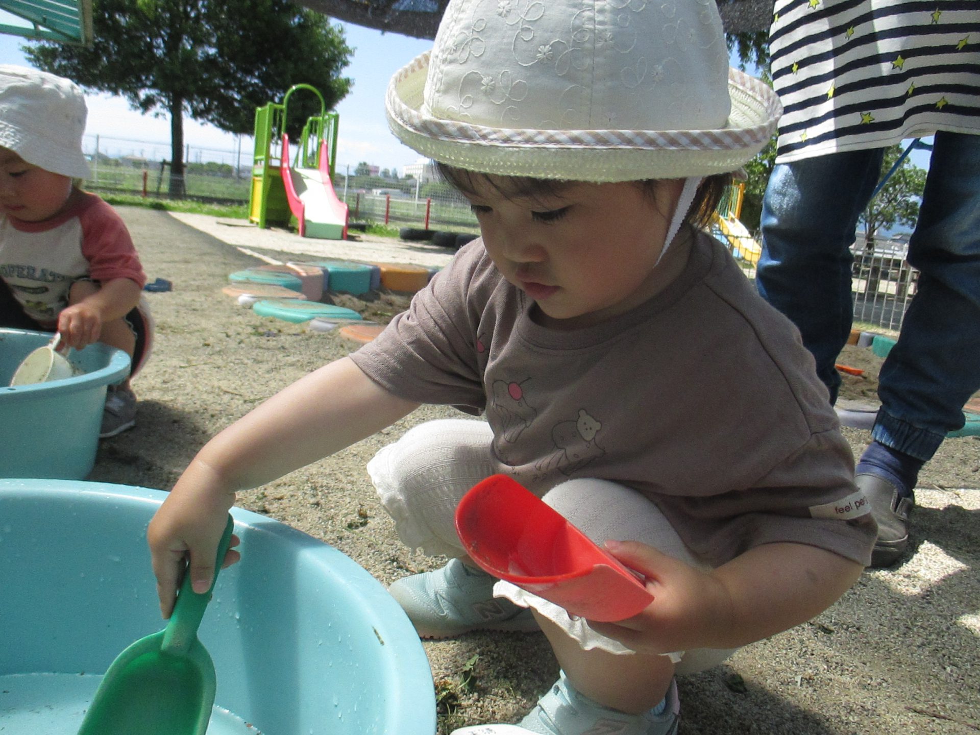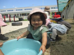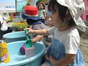 水がちょっぴり苦手な子、とっても大好きな子‥と一人一人の子ども達に合わせて水を楽しめるように遊びを考えていきたいです。