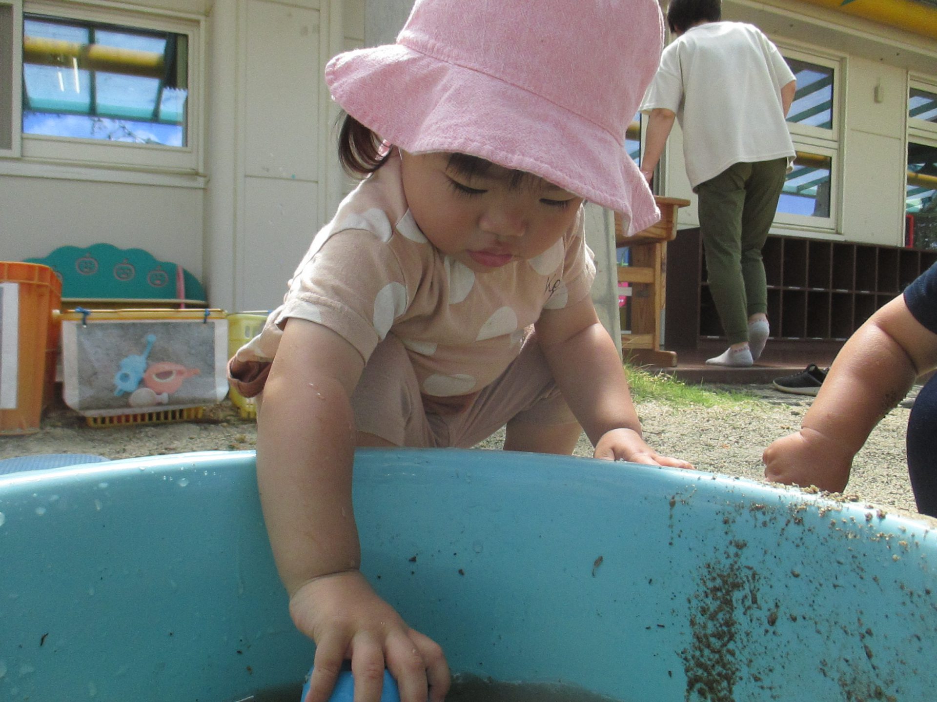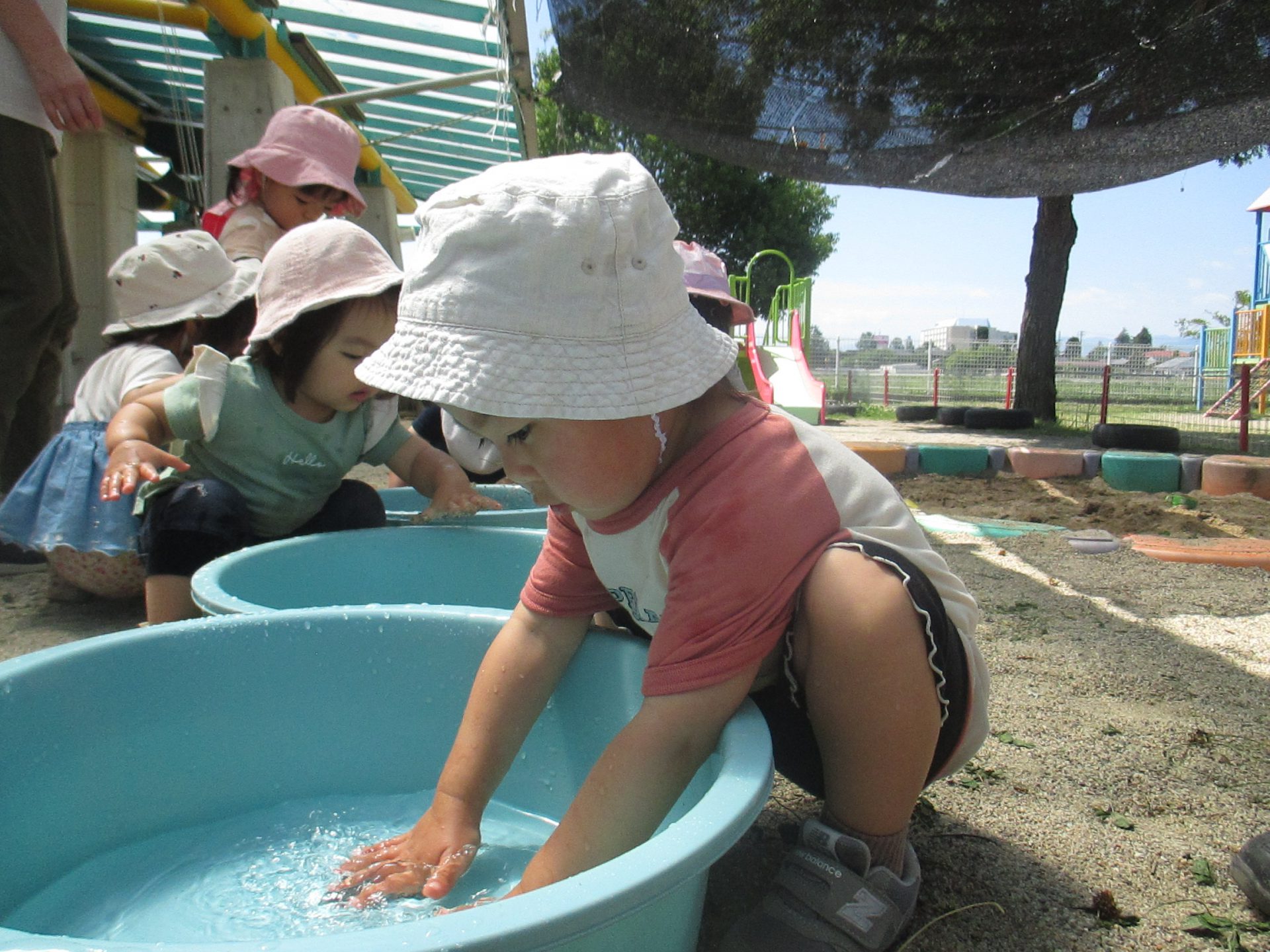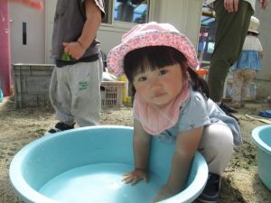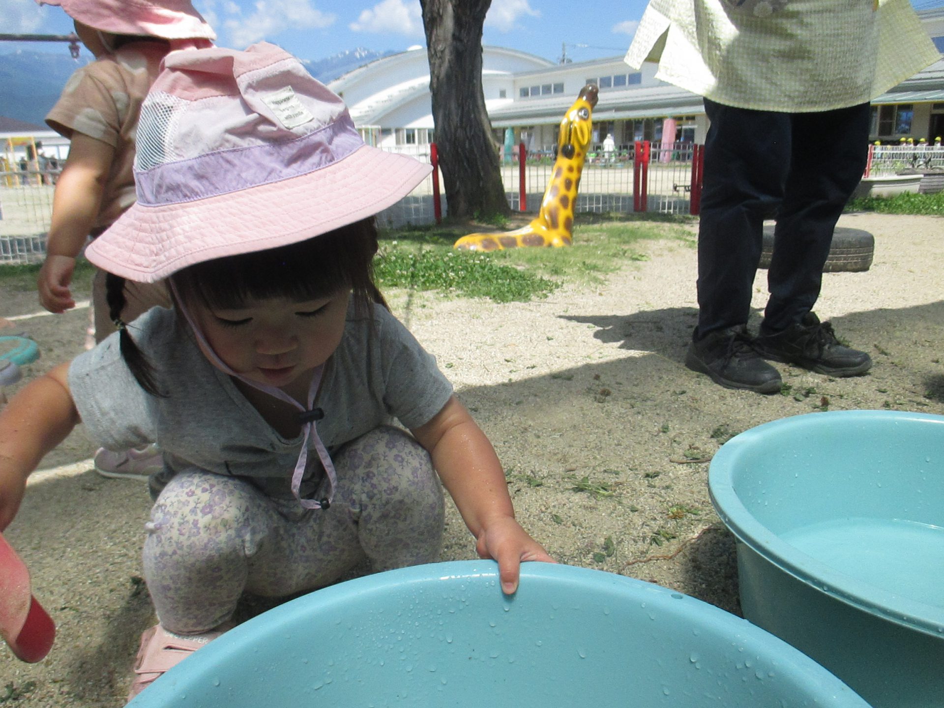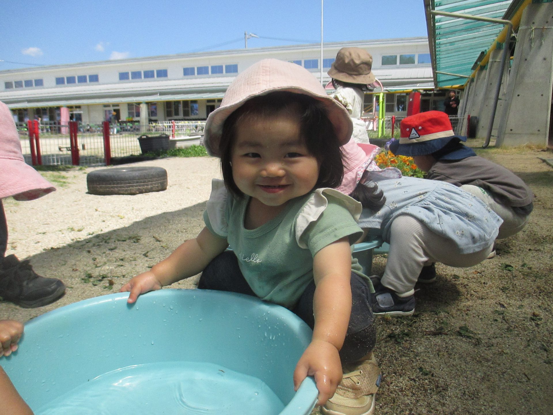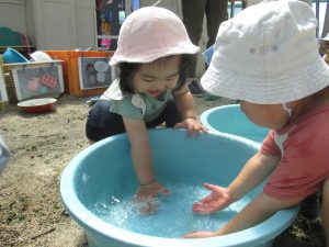 暑くなってきたある日、タライに水を入れてみると「なになに?」と子ども達がワクワクした目で近付いてきました。