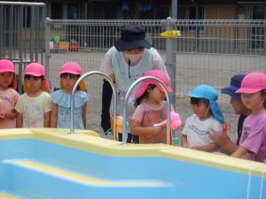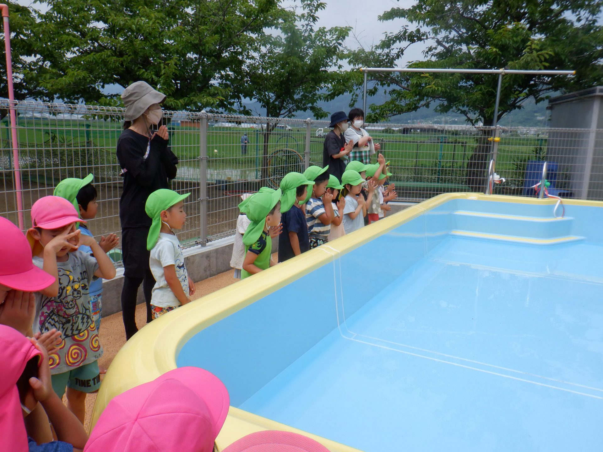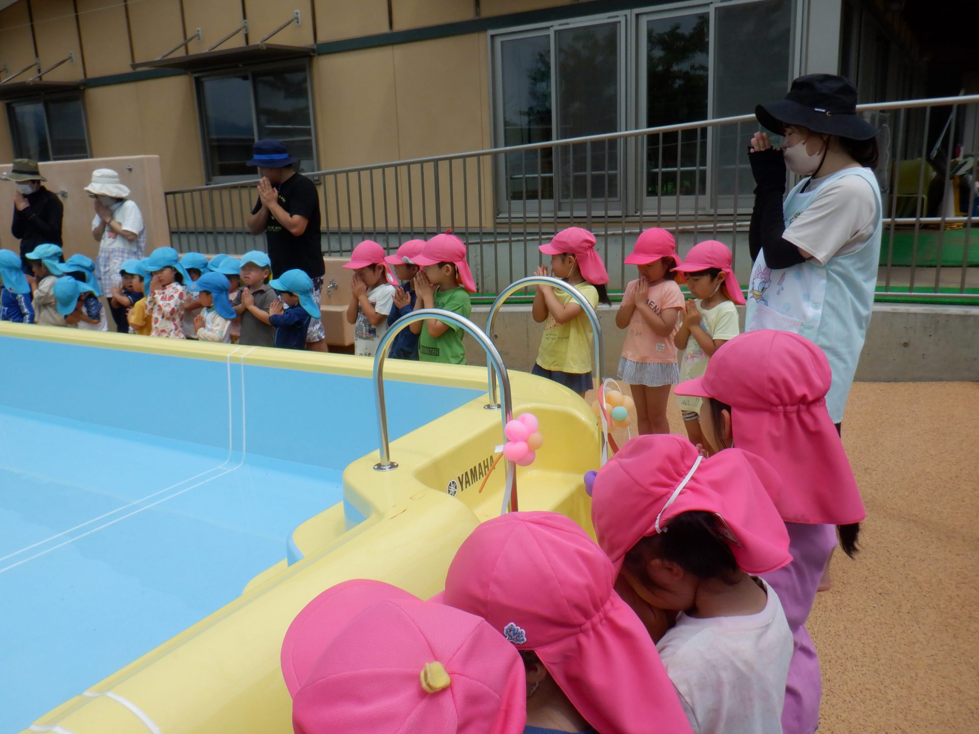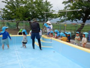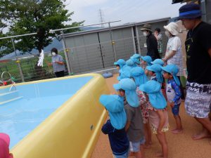「怪我なく安全に、たくさんプール遊びができますように!」と子ども達も一緒にお祈りをしています。