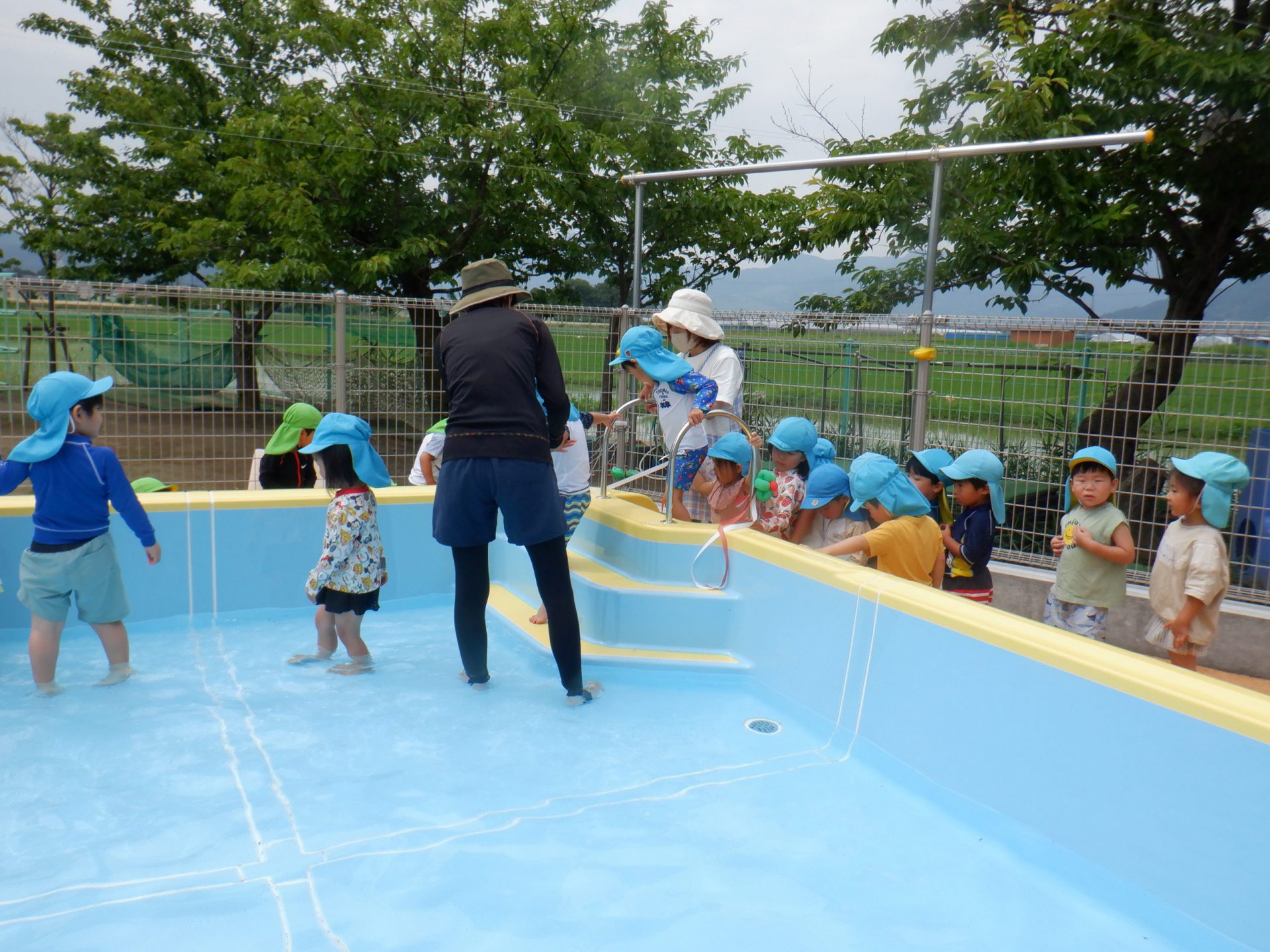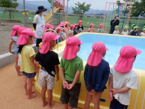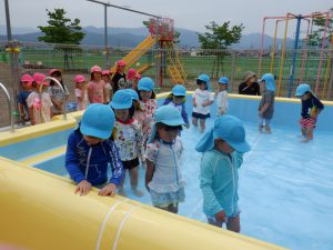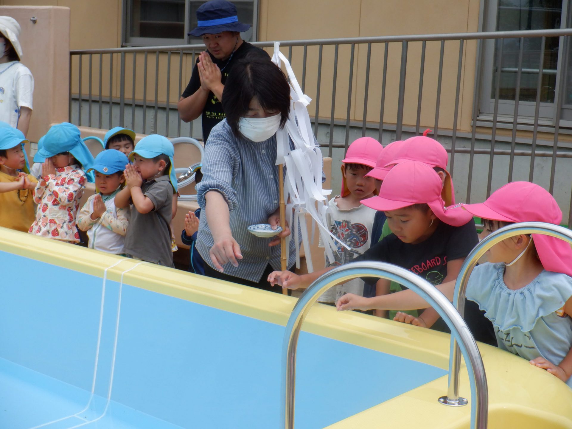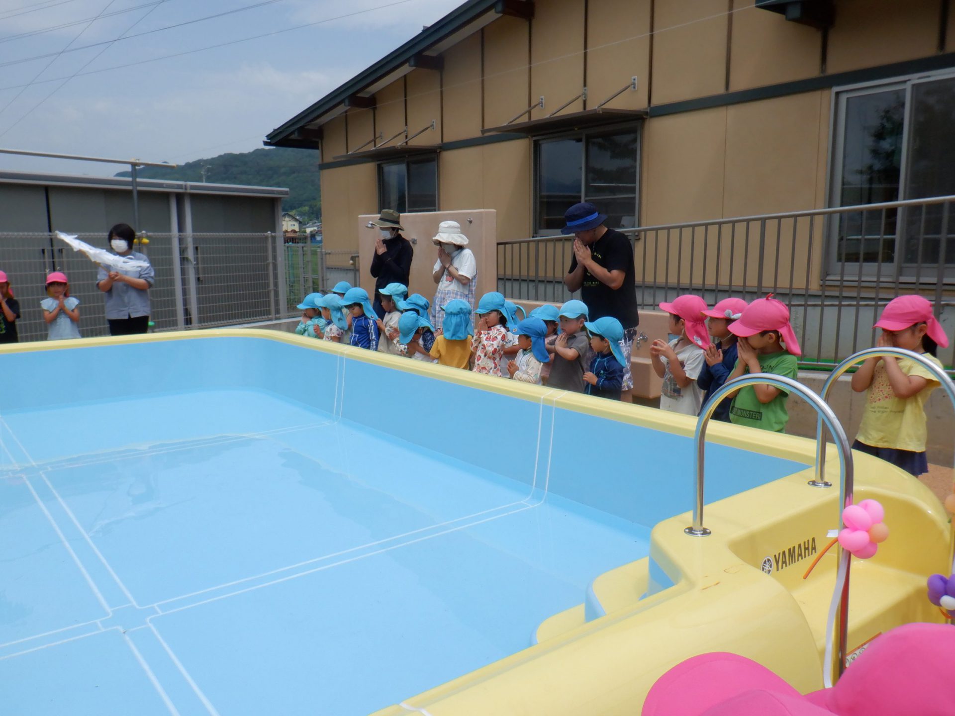 「怪我なく安全に、たくさんプール遊びができますように!」と子ども達も一緒にお祈りをしています。