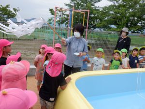 園長先生と年長児が安全にプール遊びができるようにお塩を入れてお清めをしました。