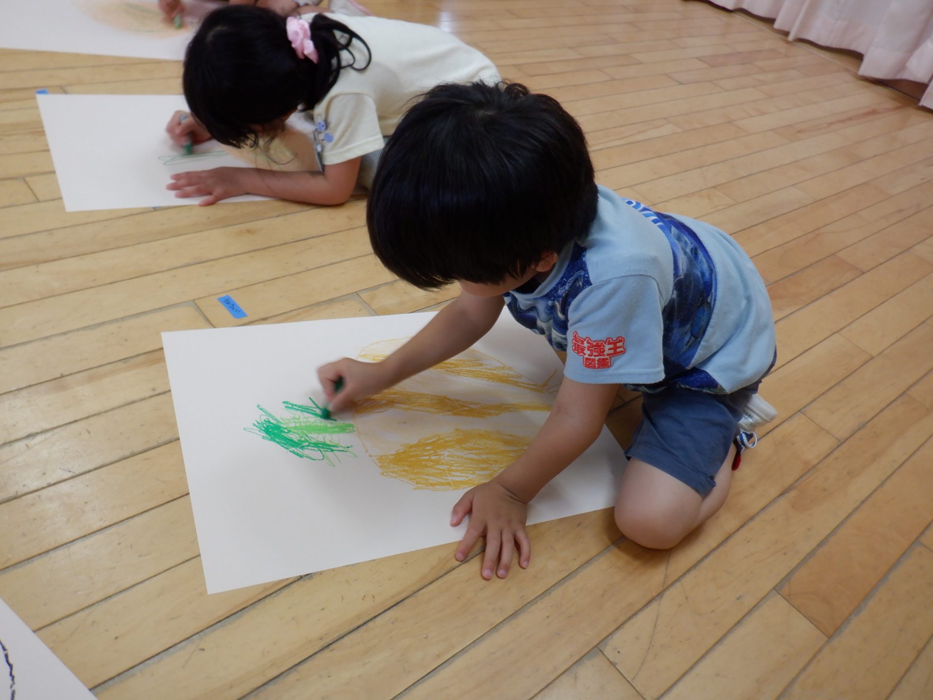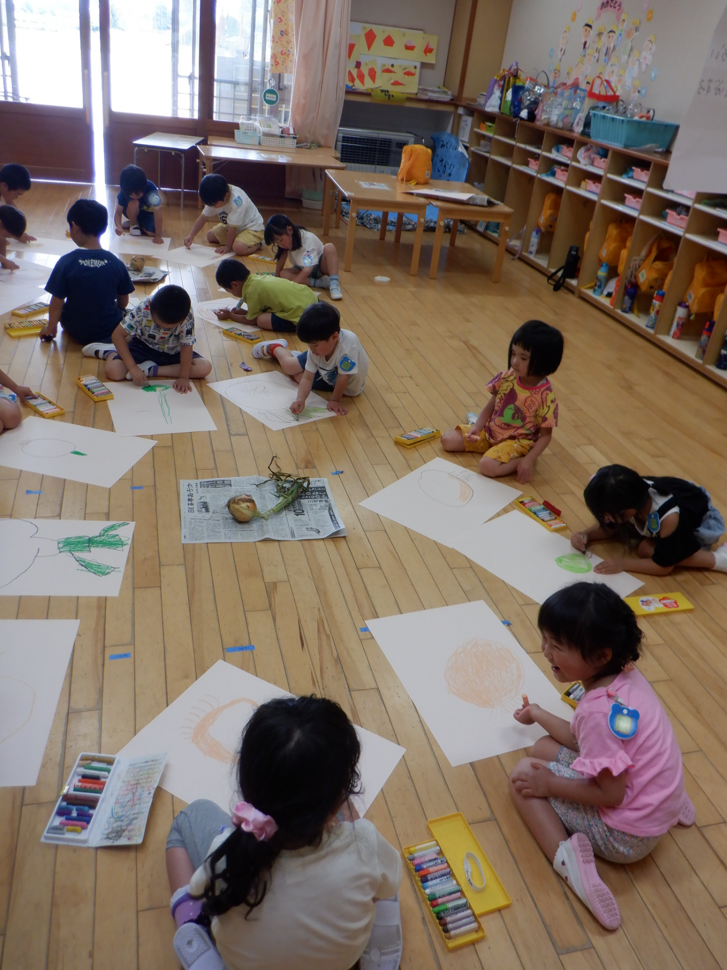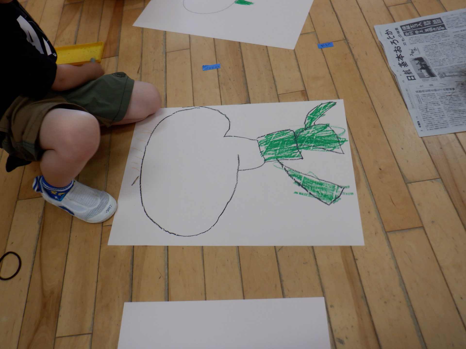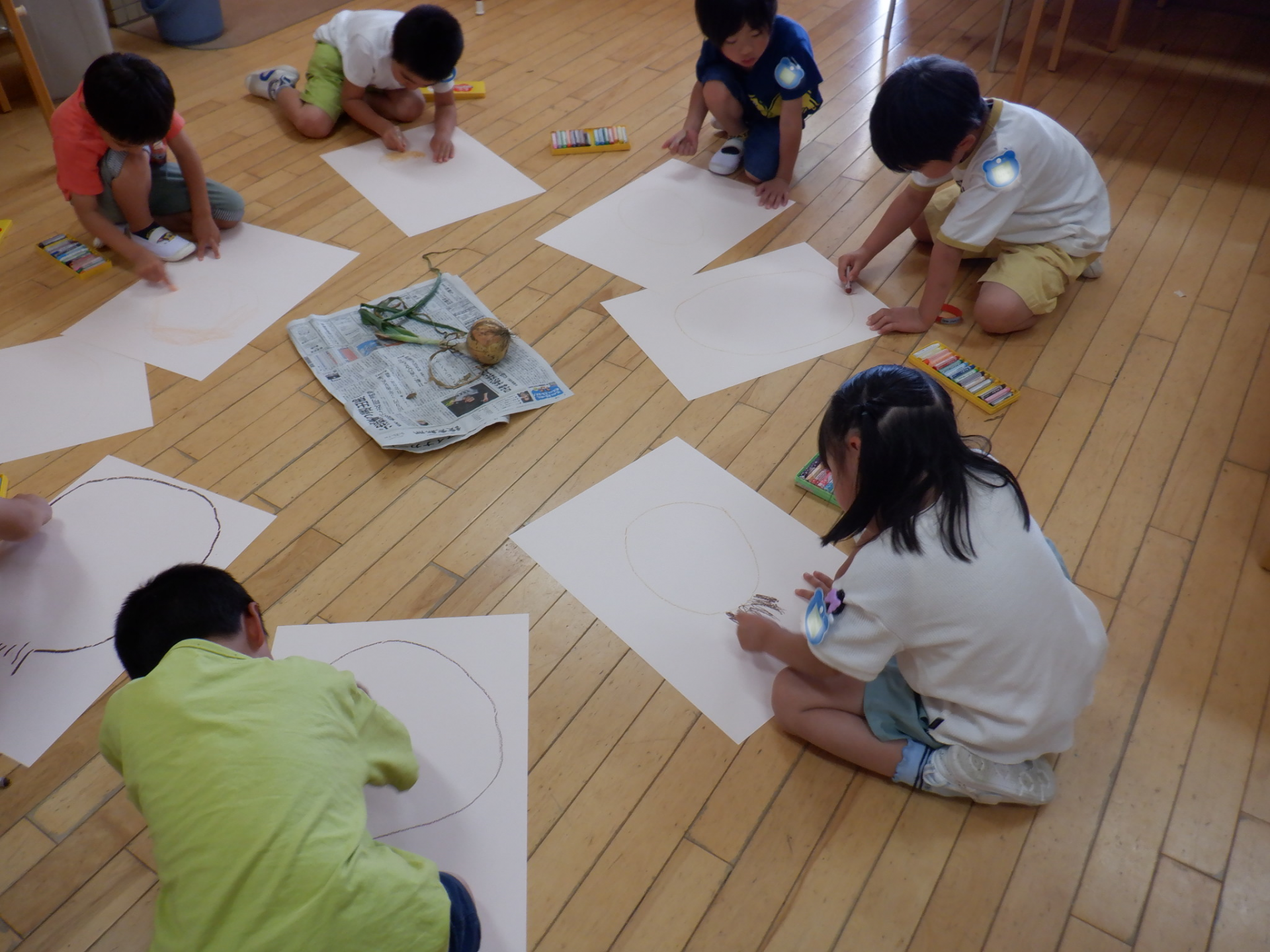 「ほんとうだね」と玉ねぎの色・形・匂いを見たり感じてから描きました。