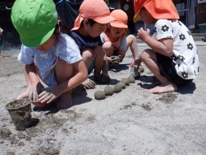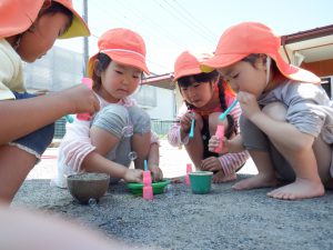 そんな時、どろだんご作りでは、年長児がアドバイスをしてくれました。異年齢の関わりによって泥団子を作るには水の量を調節すると泥が固まることを学ぶことができました。来年度は、小さいお友達に教えられるような年長さんになってほしいです。