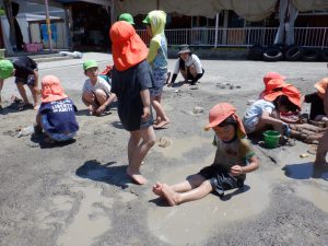 ・水に少しずつ慣れる為に初日は少量のお水とシャボン玉遊びから始め、徐々に水の量を増やすとダイナミックにどろんこ遊びが楽しめる子が増えました。