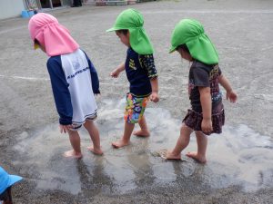 「今日は泥遊びする-」と戸外に出た年少児、年中児。水たまりを発見し、恐る恐る水たまりの中を歩いています。