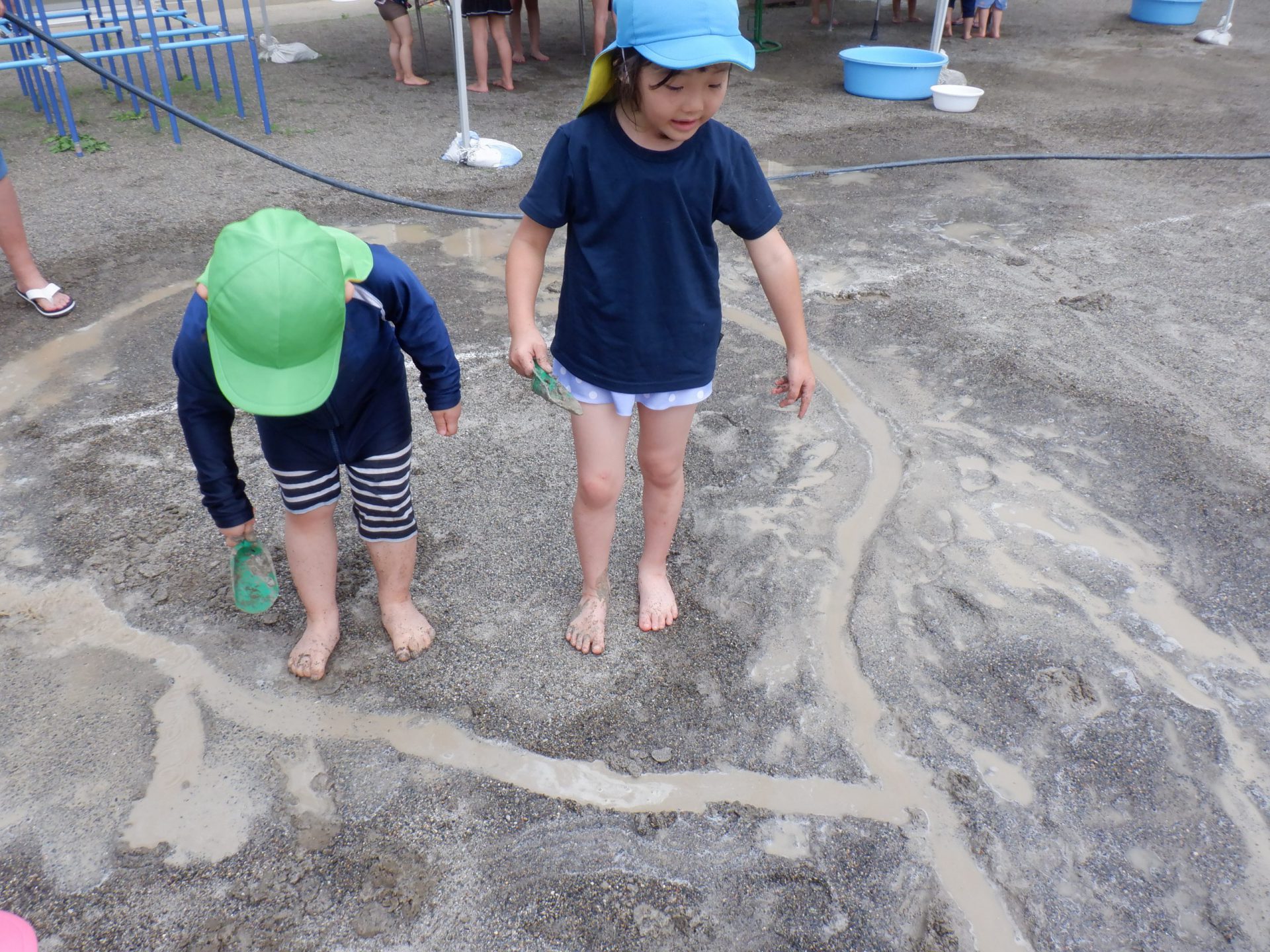 ・水や泥に触れ開放感を味わってほしい。様々な感触を楽しんでほしい。