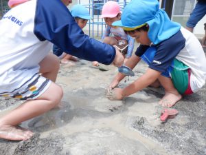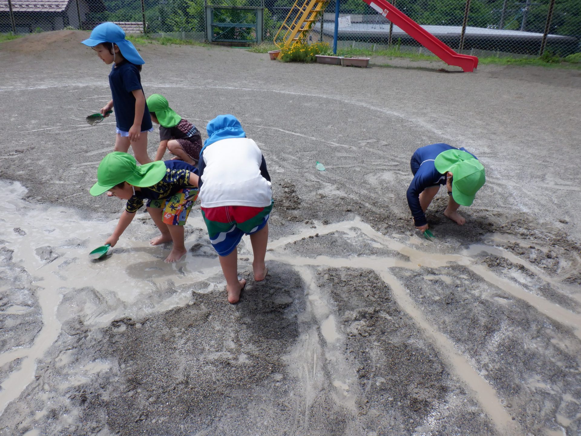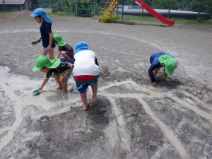 自分の掘った溝がお友達が掘った溝と一緒になって合わさると「つながったー」「こっちもつながったー」と喜ぶ声が聞こえました。
