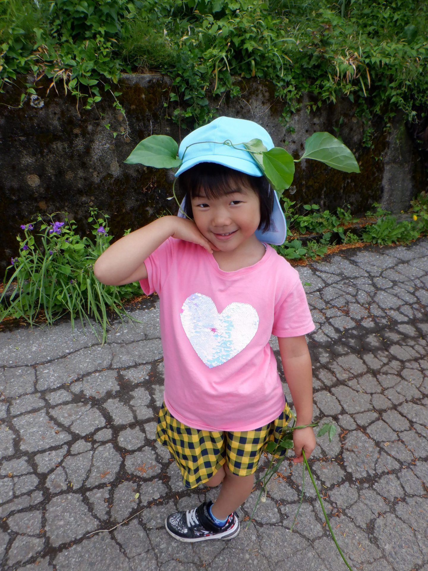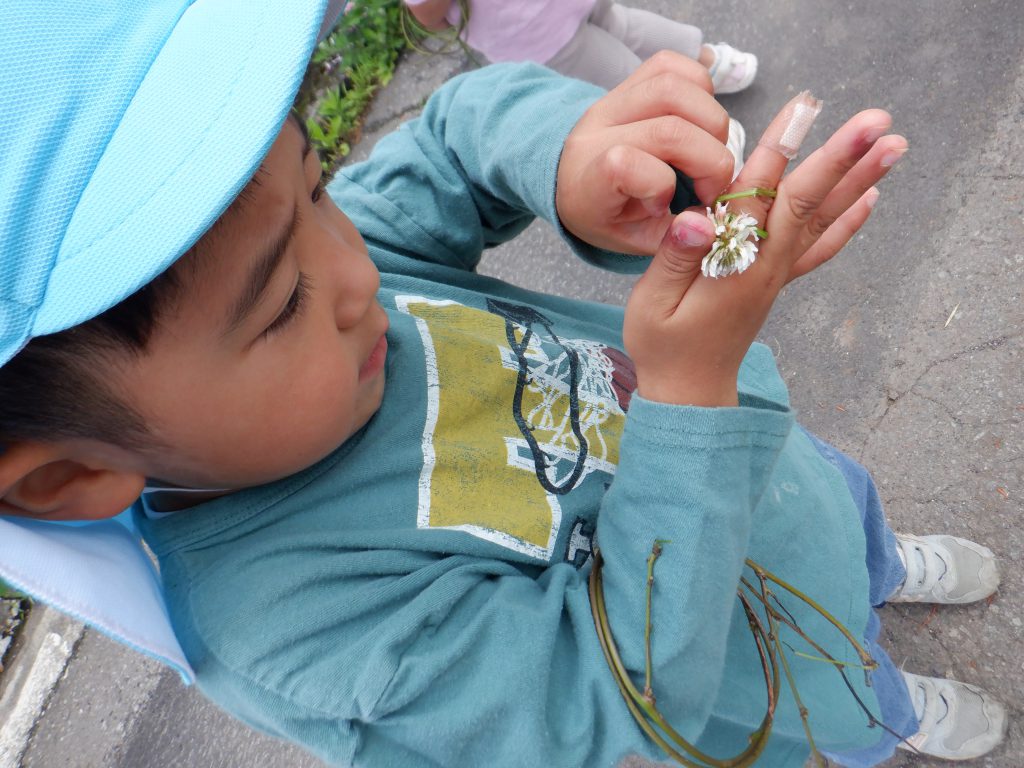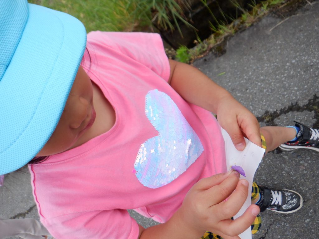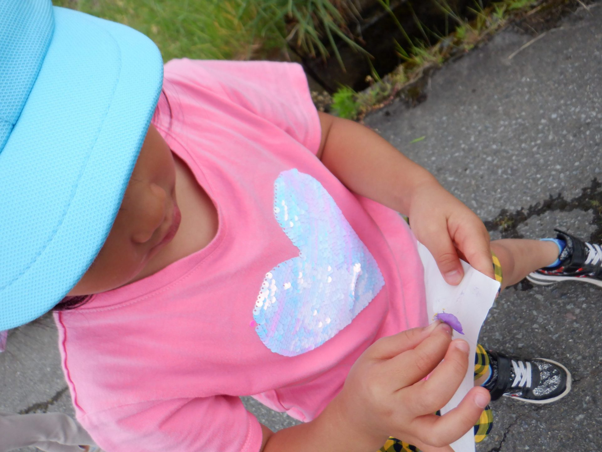 最近絵の具で色あそびをしていましたが、花でもできるのですね。園庭のプランターで育てている朝顔ももうじき開花。あそびが広がりそうです。