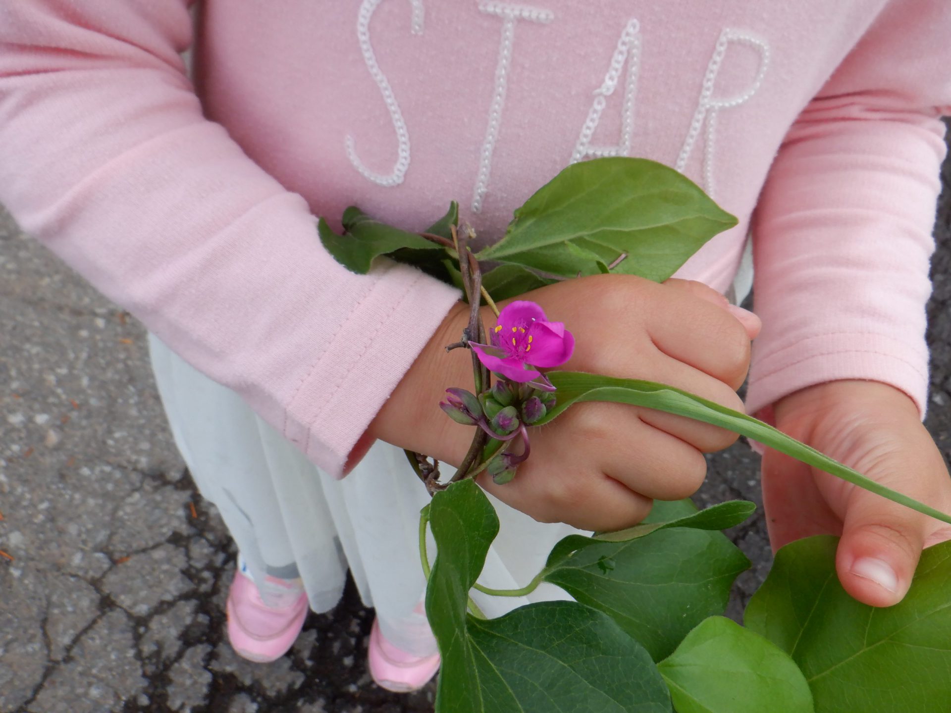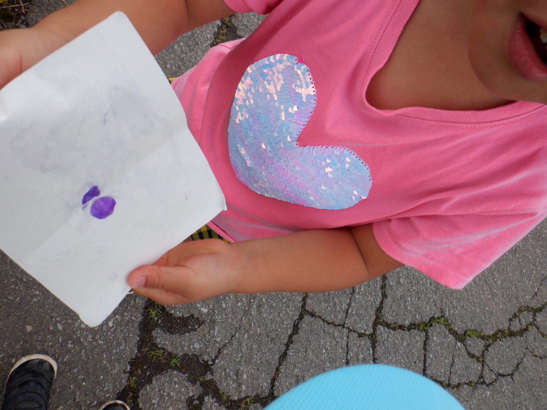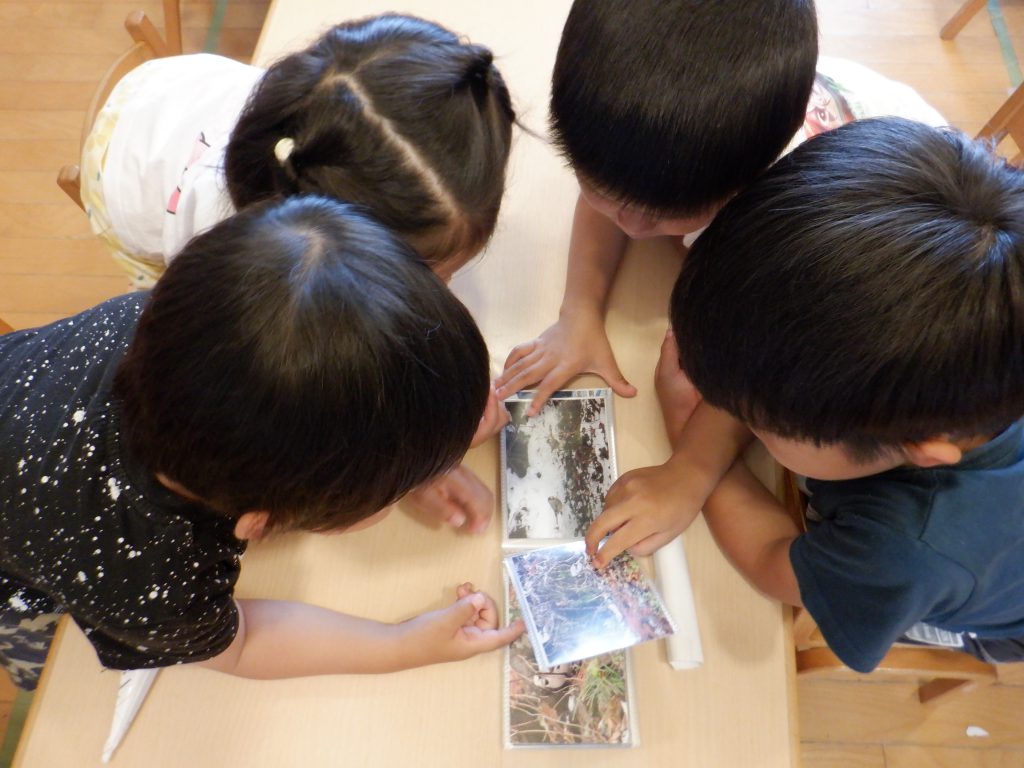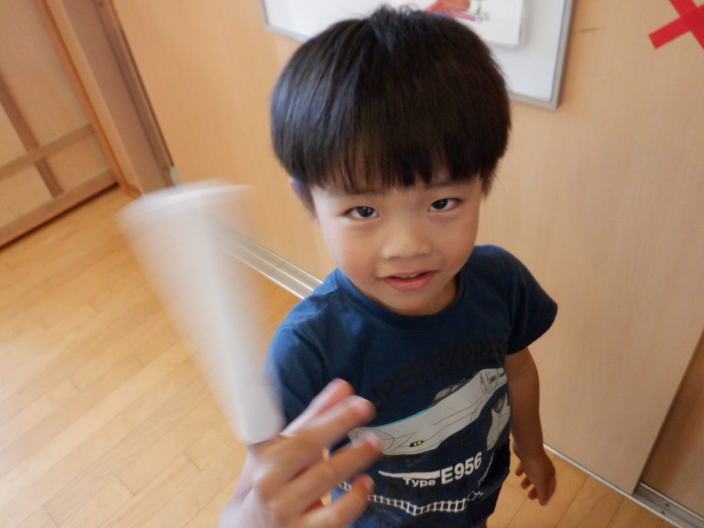 最近絵の具で色あそびをしていましたが、花でもできるのですね。園庭のプランターで育てている朝顔ももうじき開花。あそびが広がりそうです。