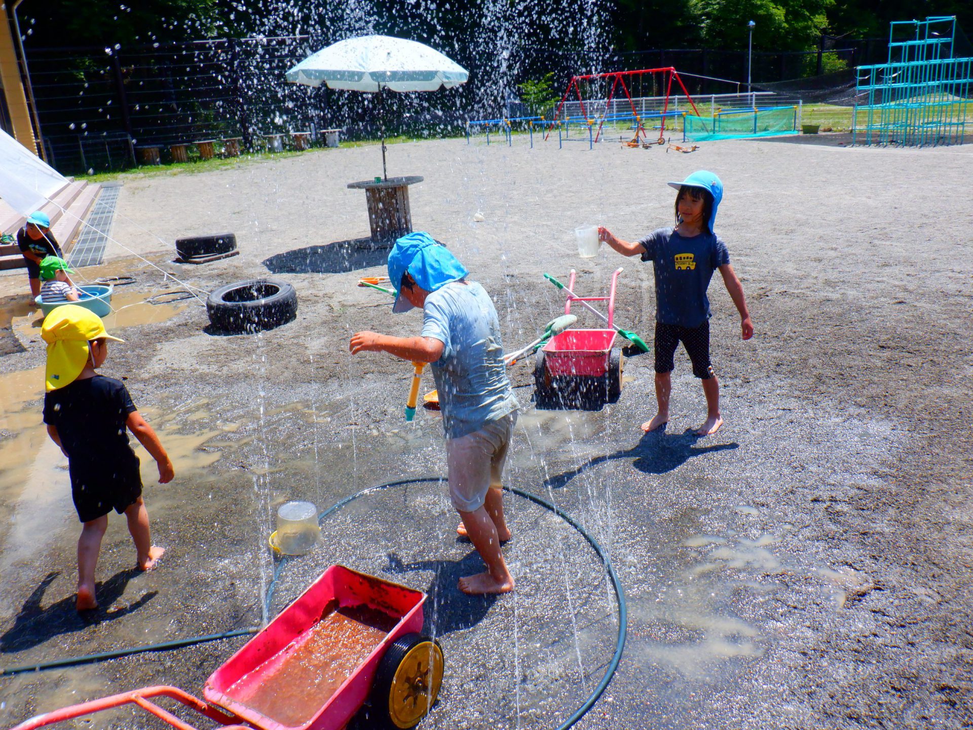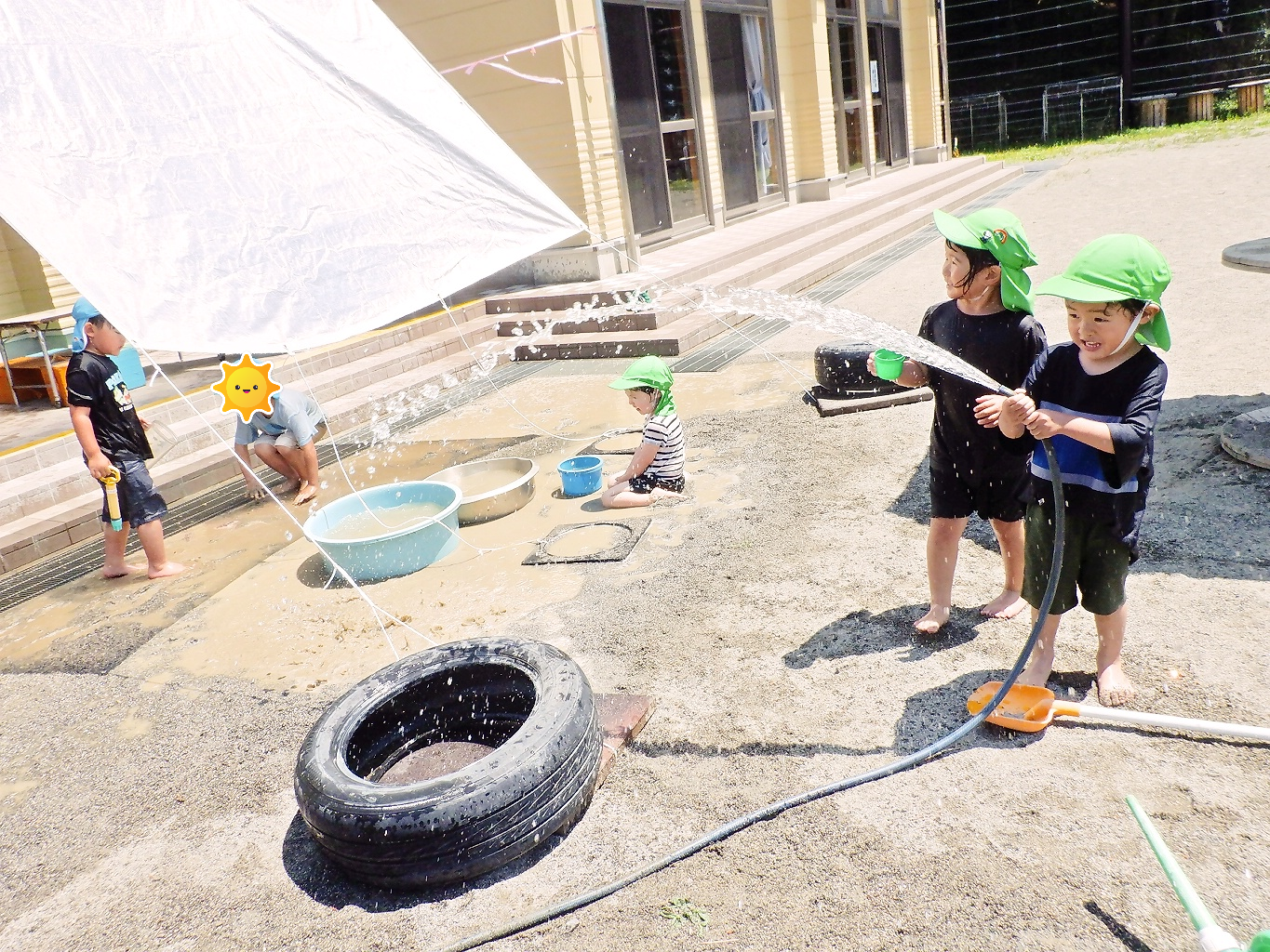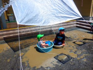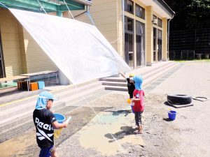 こちらでは、屋根から張ったシートに水をかけています!子どもたちの遊びは、どんどんダイナミックになっていきます。