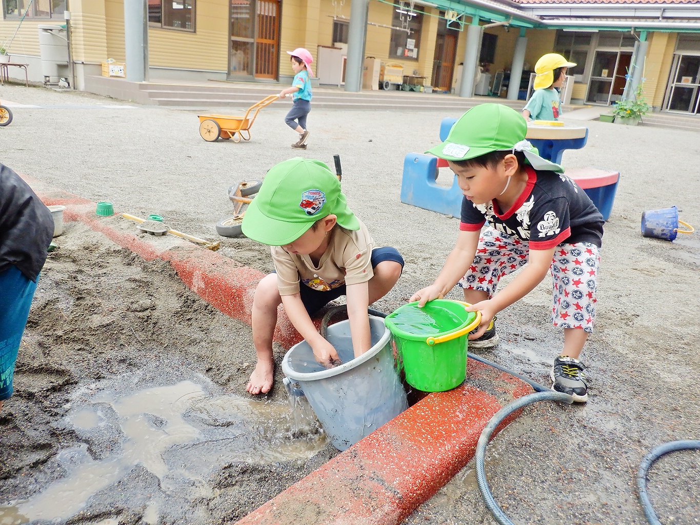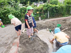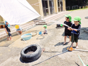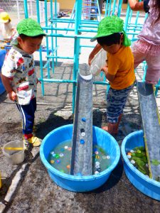 また、水で遊ぶ中で水の流れに興味を持ち、工夫し変化を加えることで友達と思考錯誤して遊ぶ面白さも感じて欲しいと願いました。