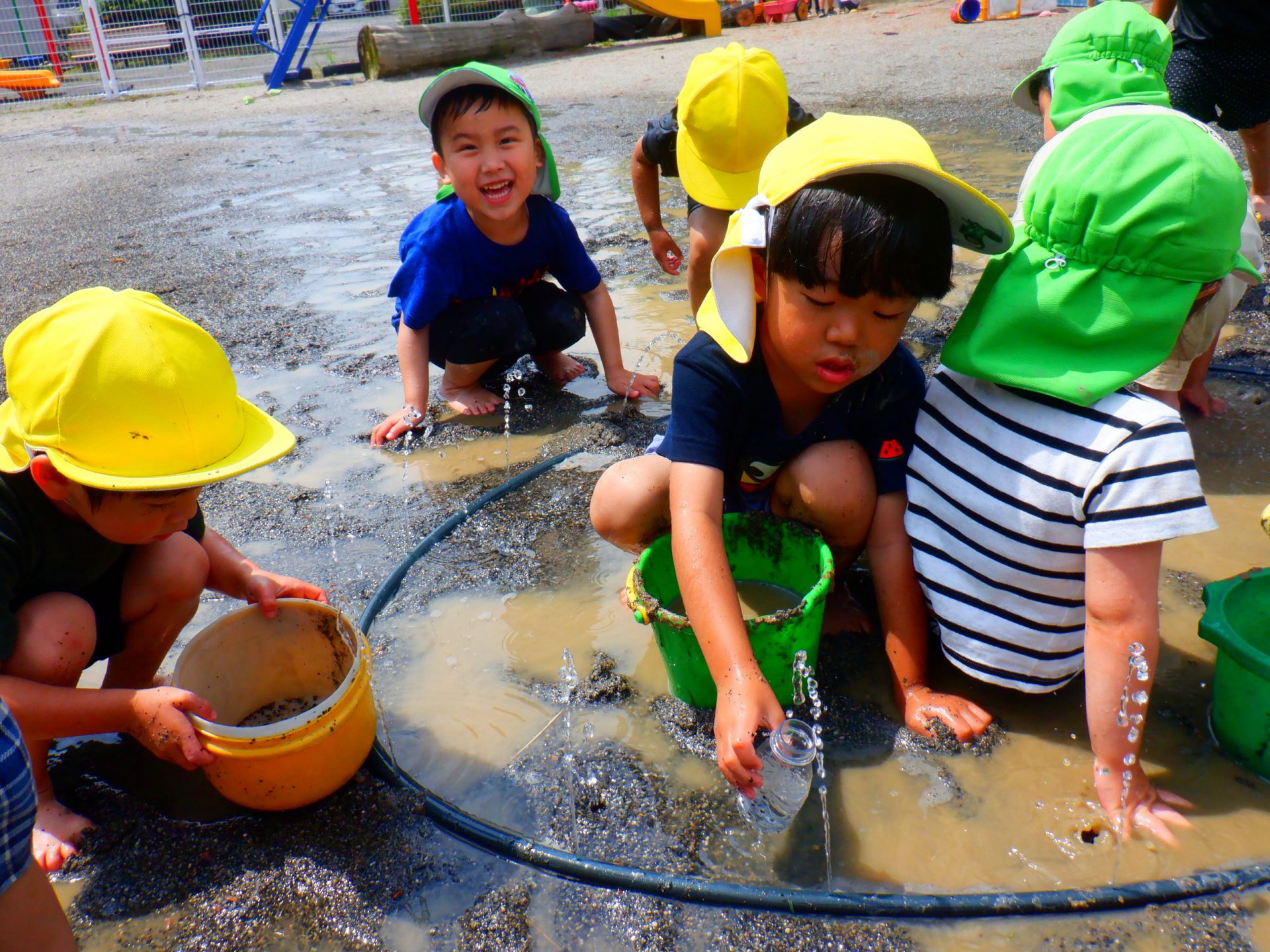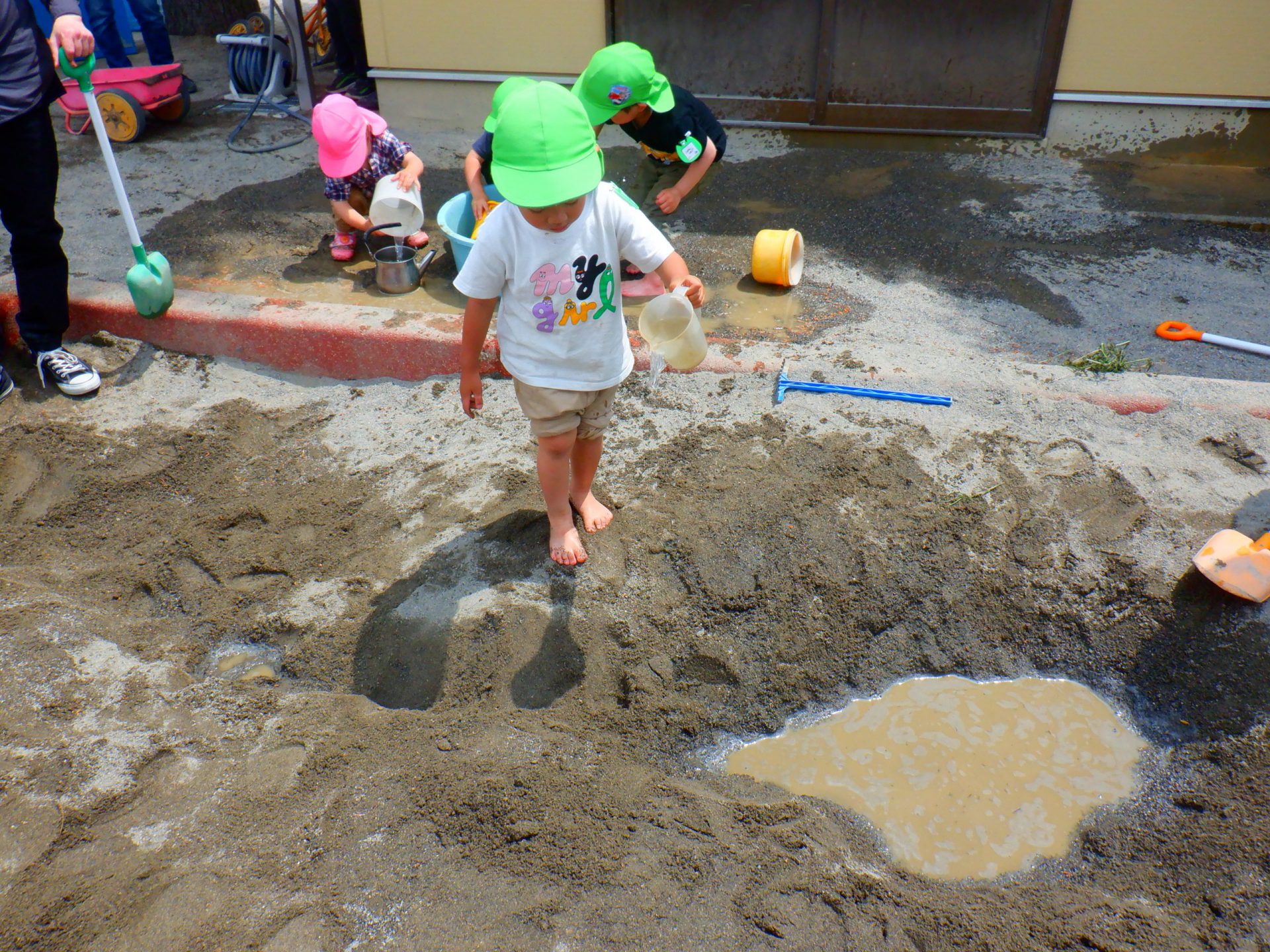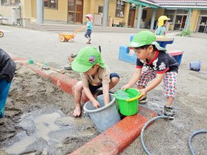梅雨入り間近の朝から暑い日、子どもたちの遊びの興味は水や砂、泥に向いてきました。