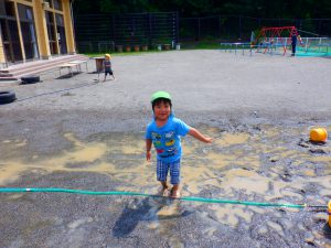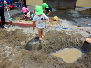 砂場の上から、バケツで水を流すことなら、ぼくにもできる!っと思ったのでしょう。靴や服が汚れないようにしながらも、自然と”お手伝い”をして・・・このあとは、初めて靴までびっしょりにして楽しく遊びました。