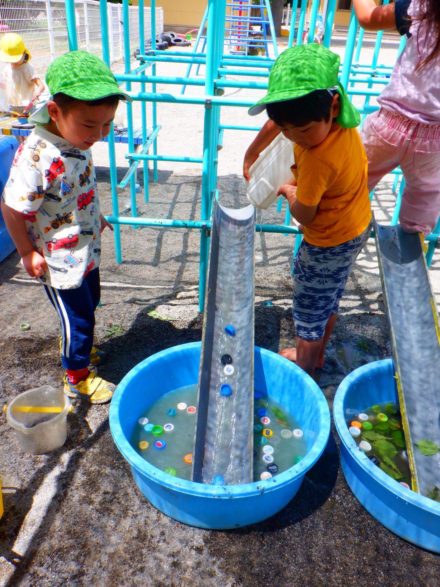 とよを見つけ、水の流れに興味をもつと、葉やペットボトル・キャップを集め、流しそうめん!?遊びを楽しみ始める子も。「流れた流れた!!もっとやってよ!」