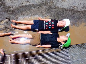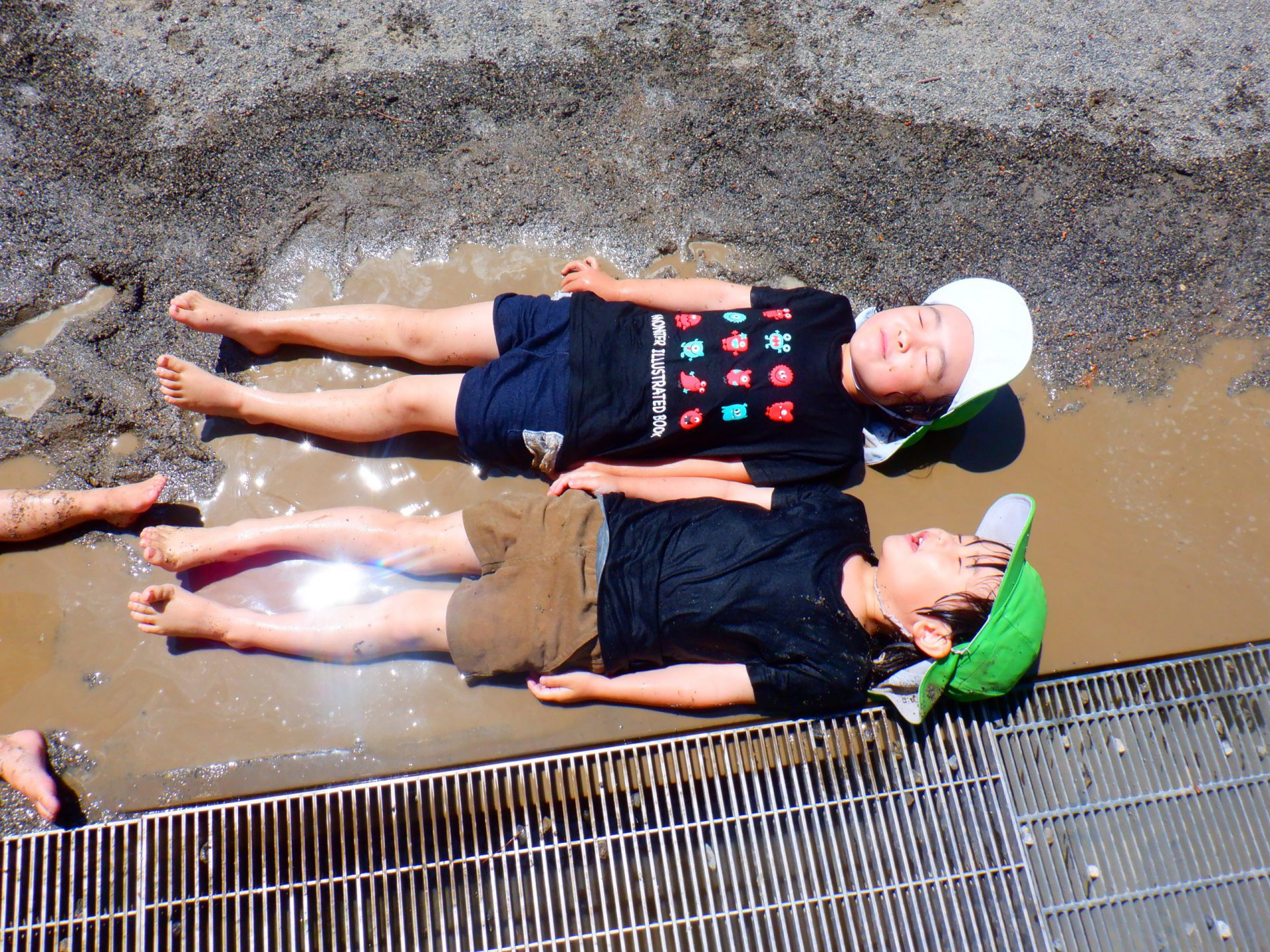 水遊びでできた水たまり「なんだかあたたかいな」「寝てみちゃお!!」