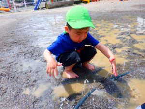 「見て見て!たくさん(水が)出てるよ!」ホースを足で踏むと水の勢いが変わることに気づいた子。