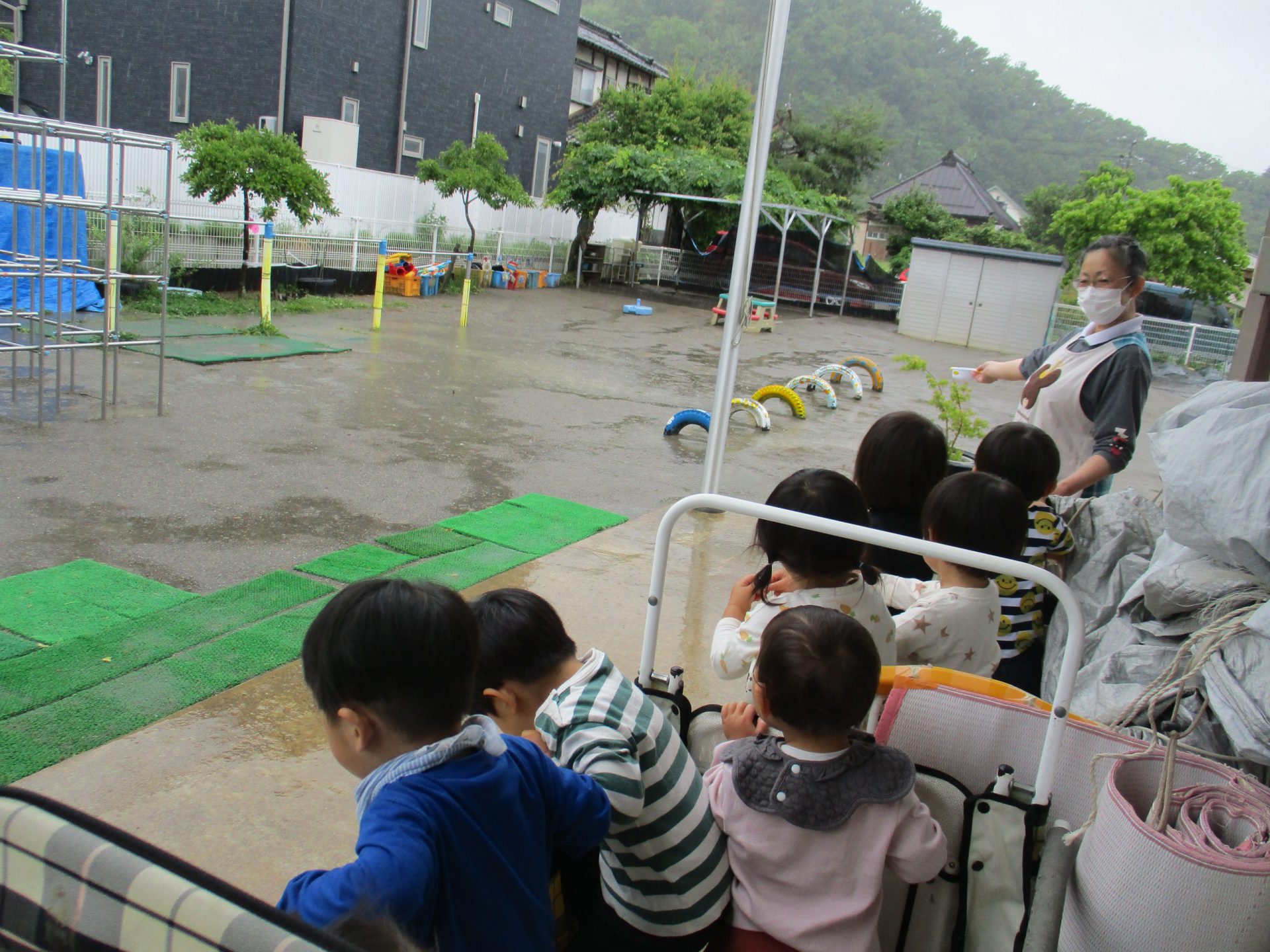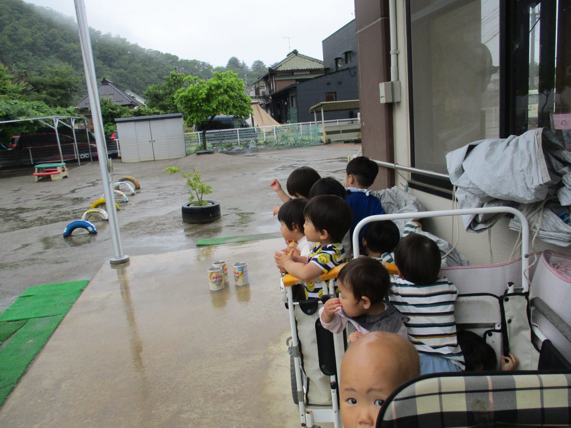 ・窓に貼り付いて、みんなで雨を見ていたのでこれは直接外に出て雨を感じたい!と思い、初めはすのこに座ってみていたが全員座れなかったので散歩車に乗って雨の近くまで行ってみる。何か雨の音が分かる物があればいいなと思い、ミルク缶を置いてみる。すると、ミルク缶に落ちてくる音を聞き「おぉ!」といい反応をしていた。