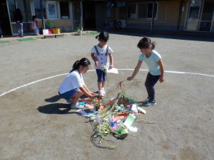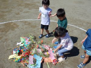 クラスごとに飾られていた笹飾り。願いごとを確かめながら園庭にそ~~っと置きます。