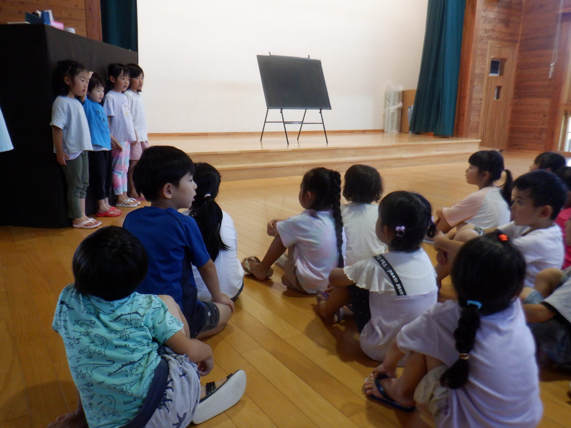 遊戯室に集まって年長児の「これから、たなばたまつりをはじめます」の言葉で<たなばたの会>がスタートしました。