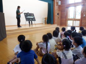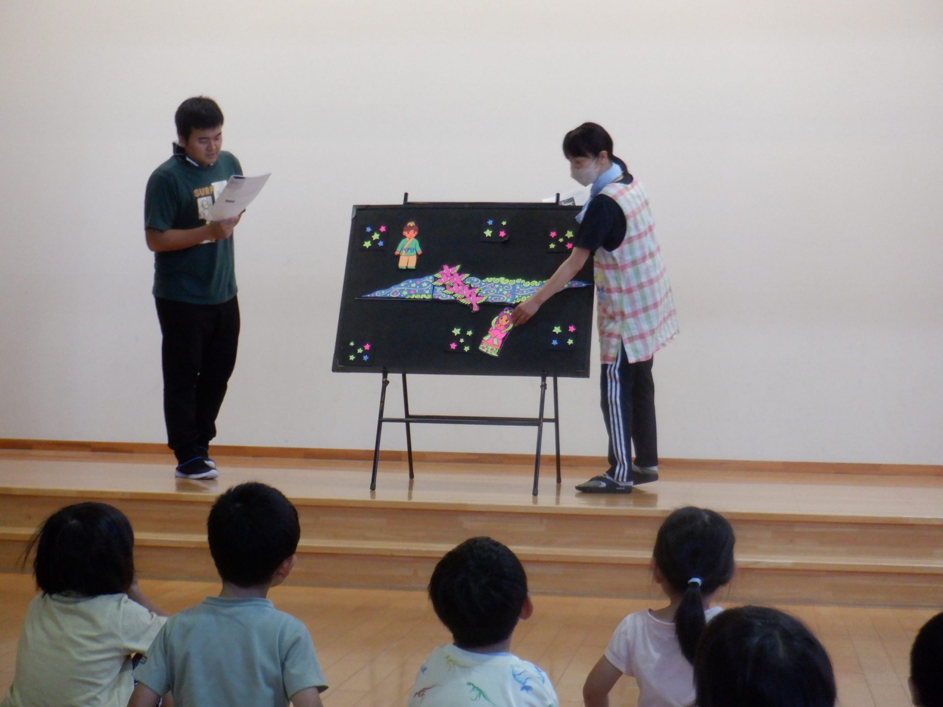 【おりひめとひこぼし】のパネルシアター。牛や星・はた織り機や神様・カササギが登場しました。