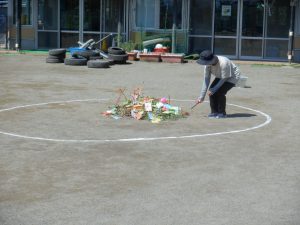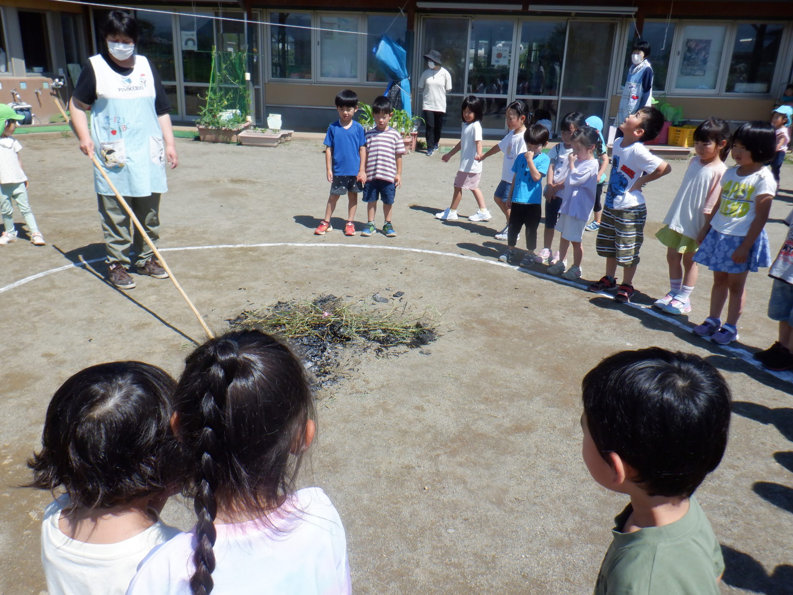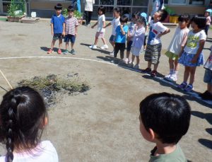 「パチパチ」と音を立てながら燃える笹飾りの様子を見守りました。短冊が燃えた煙が空に昇って願い事が叶う・・・という話を聞き、手を合わせ煙の行き先を目で追いながら、願いごとをしている子どもたちでした。