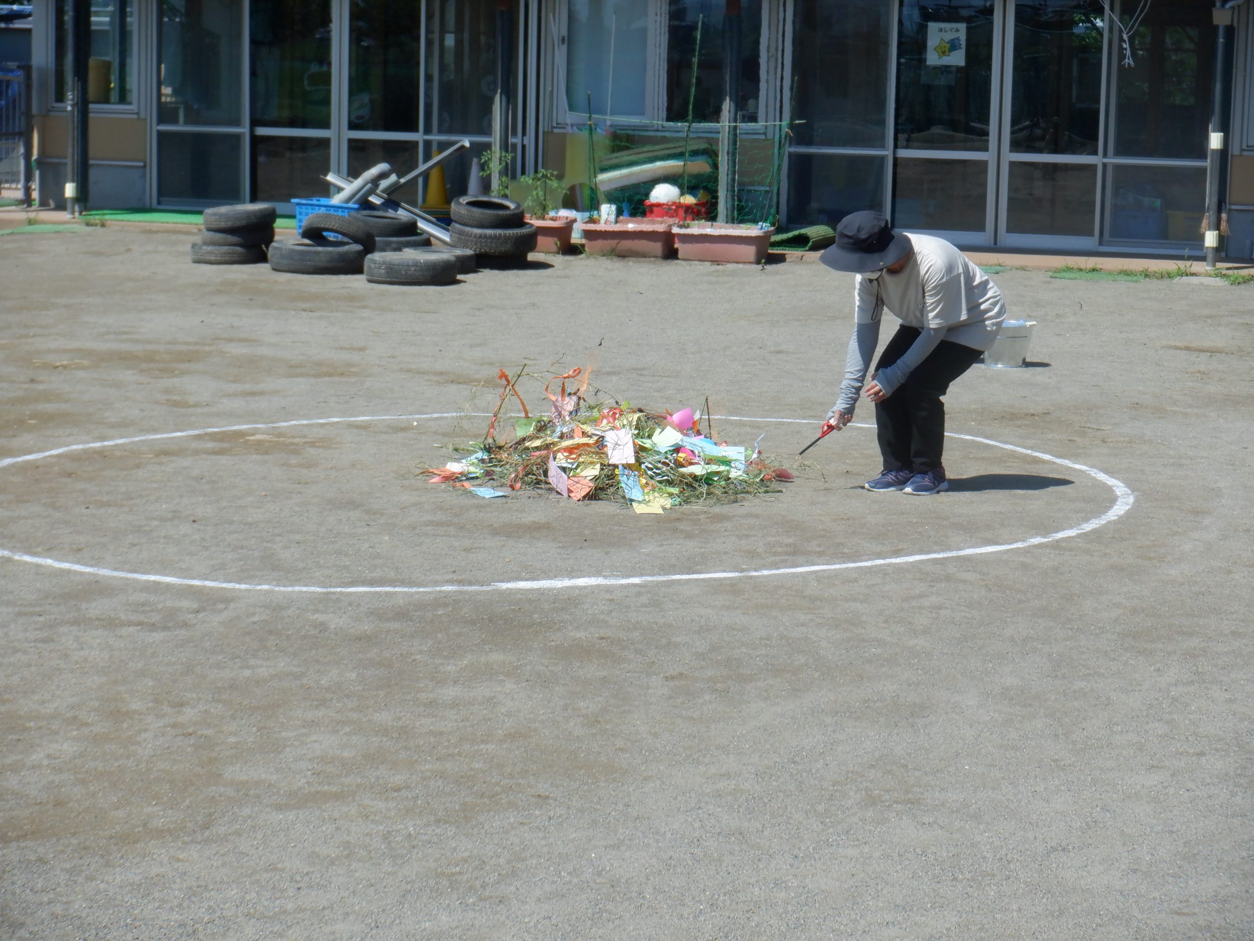 会場を園庭に移して、みんなが見守る中、園長先生による笹飾りへの点火。