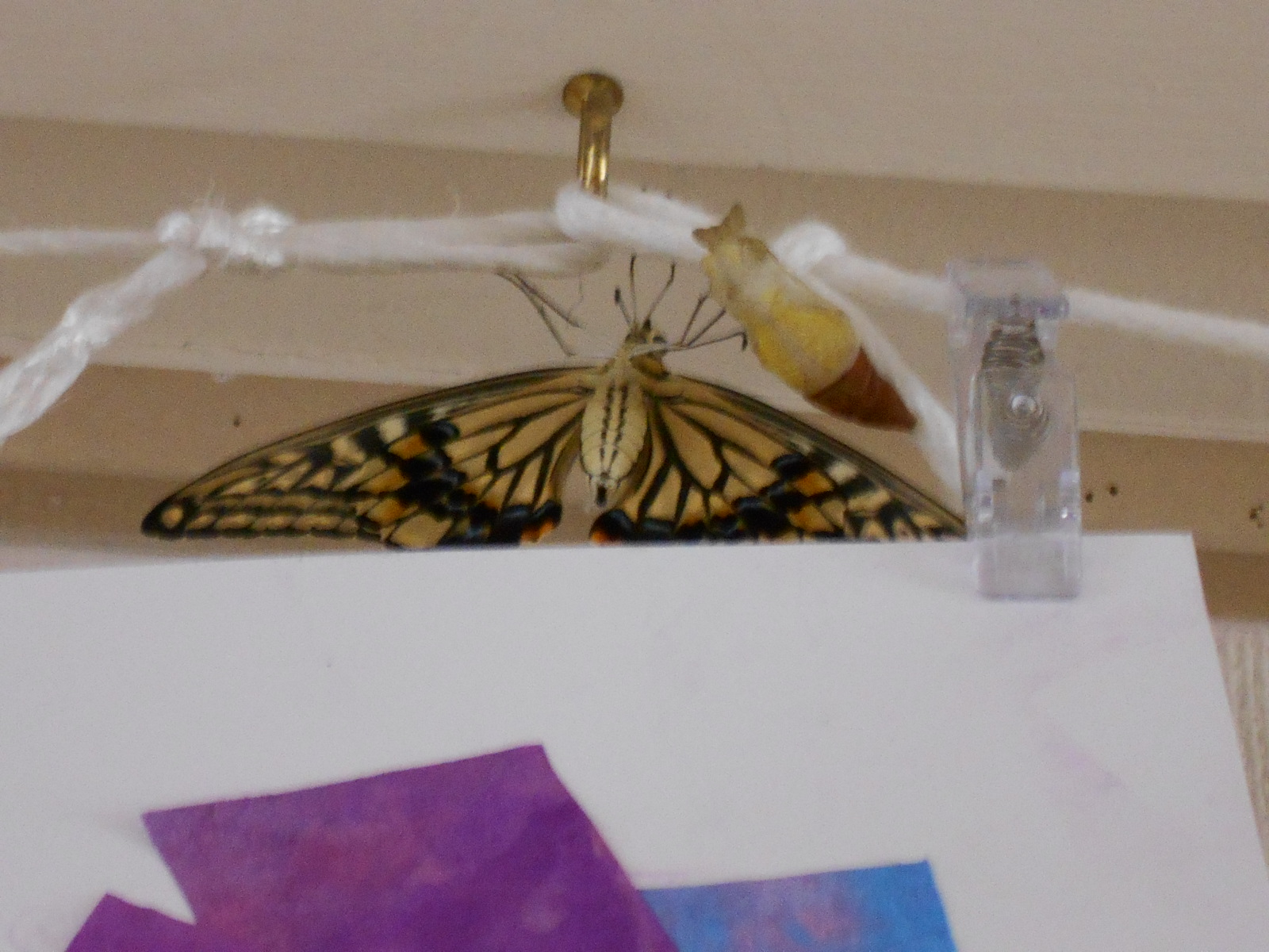 (↑子ども達の制作を飾るヒモでサナギになり、成虫になったアゲハチョウ)