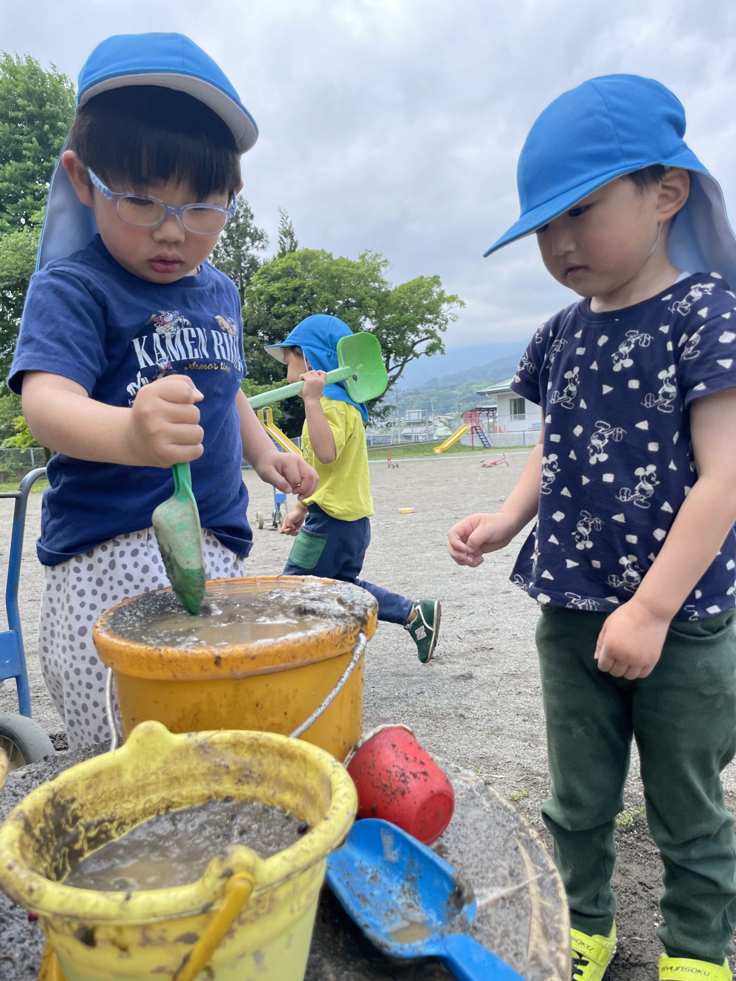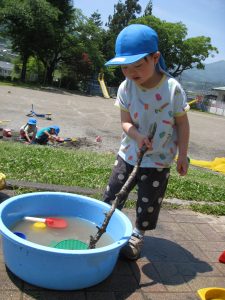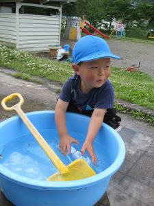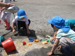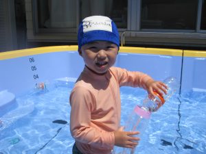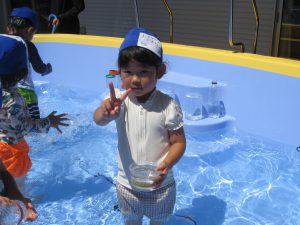 先日プール開きが行われ、年少組の子どもたち今度は水の研究、発見をはじめました。
