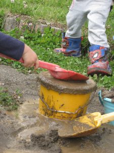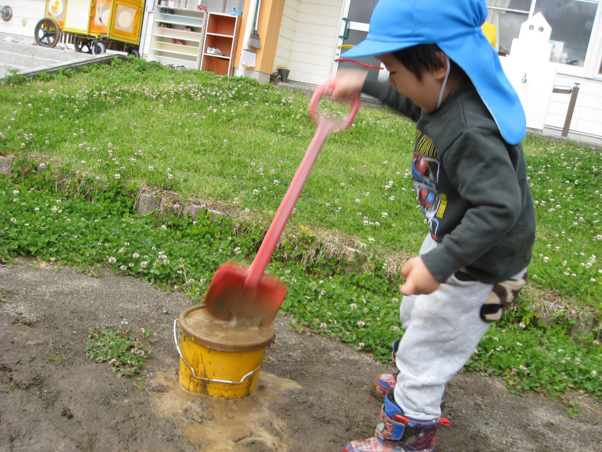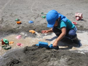 「たったこれだけの砂(泥や水)でもこんなに遊べるんだなぁ」と驚かされています。