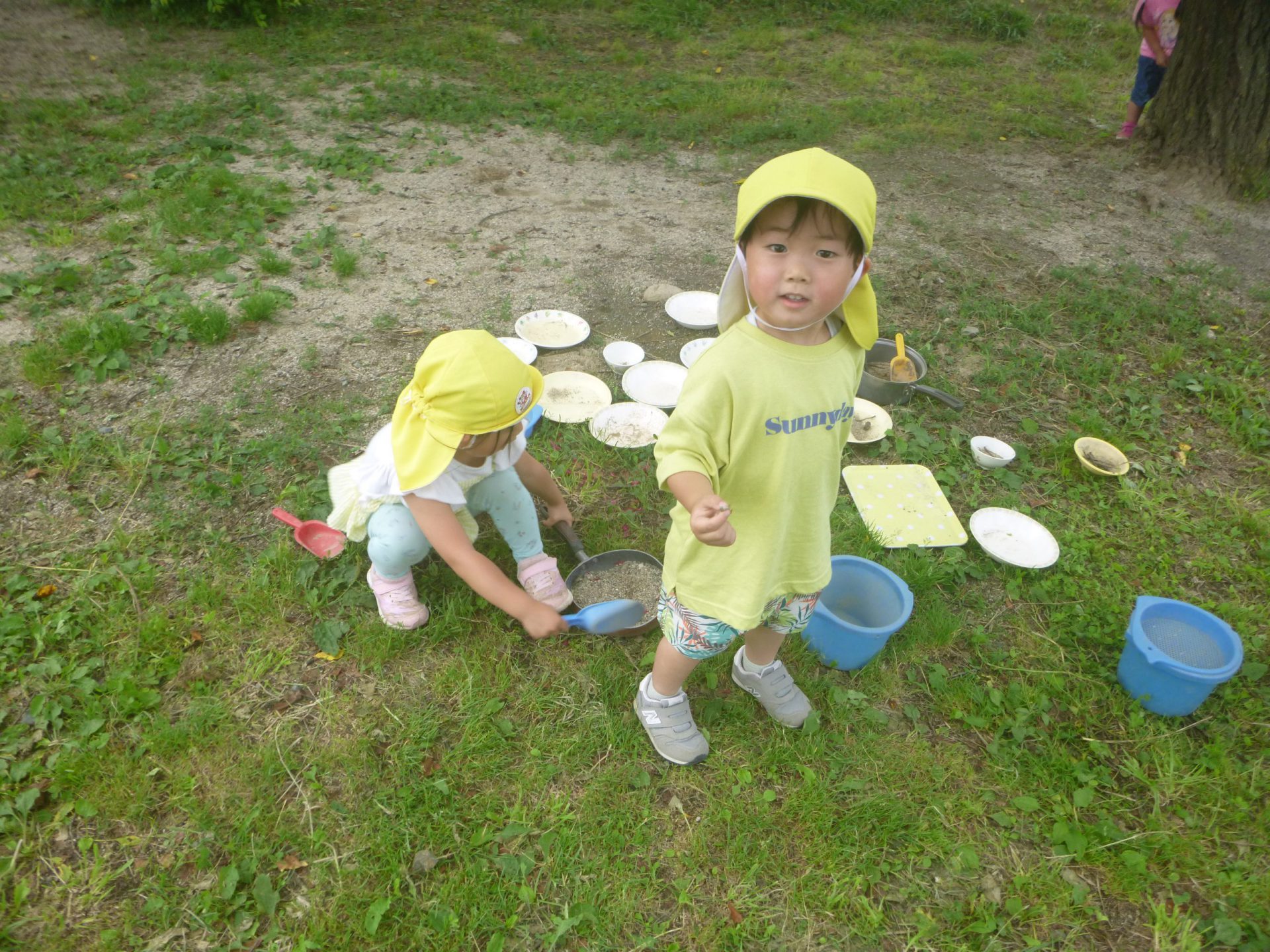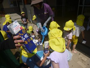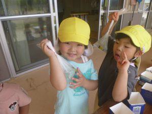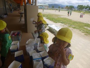年長さんが楽しんでいた色水遊び。年少さんも一緒に遊ばせてもらい、