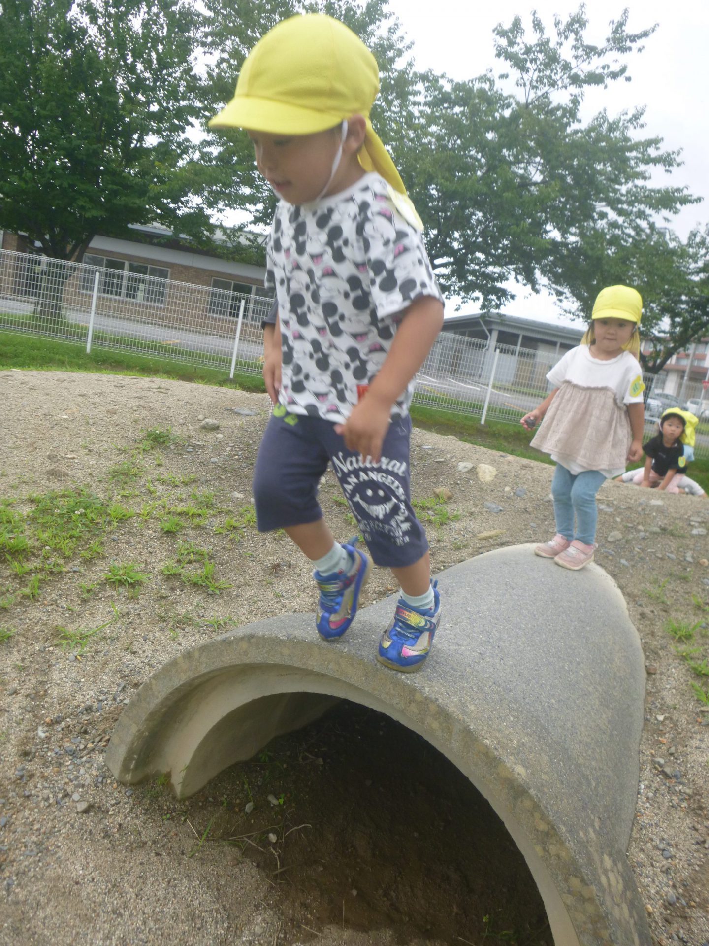 園庭で体全体を使って遊ぶ子どもたち。最初は転んで擦り傷ができたり、なかなか立ち直れない姿も見られましたが、何回も挑戦することで「できた!」「楽しい!」という経験を積むことができました。保育士も一緒に遊ぶことで子どもたちと楽しい時間を共有することができました。