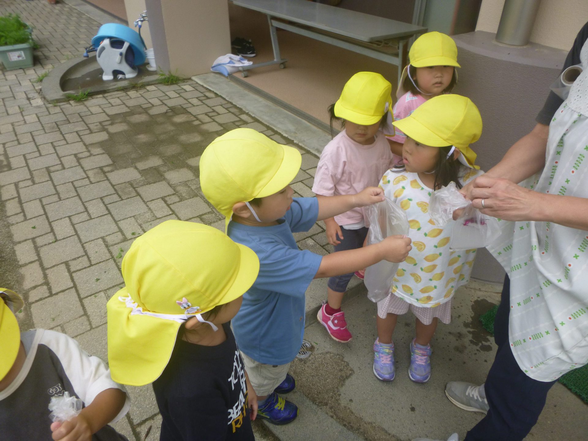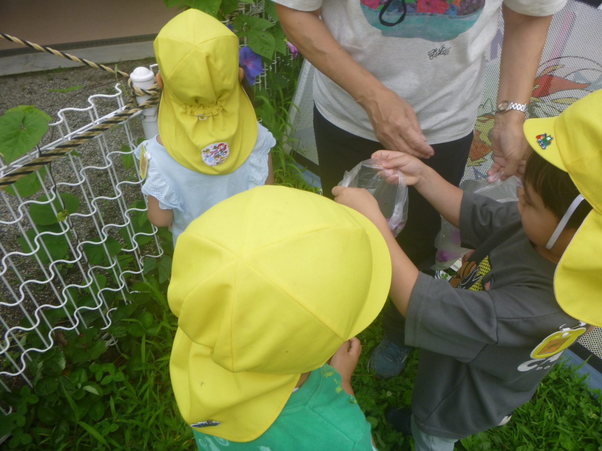 園庭を探検してると朝顔の花が咲いていることに気が付き、早速色水遊びをしました。