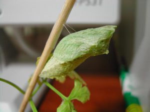 あおむしは口から白いものを出し始めたなと思うとあっという間にサナギになりました。