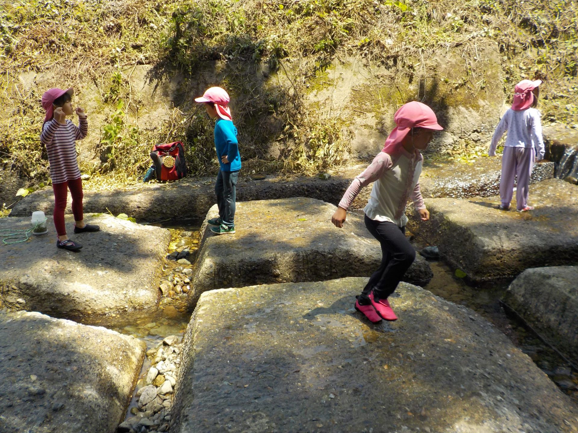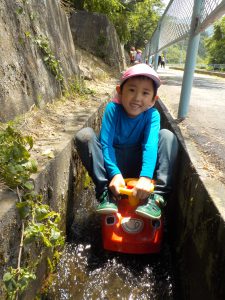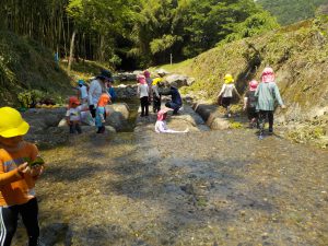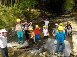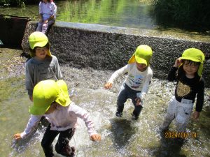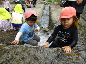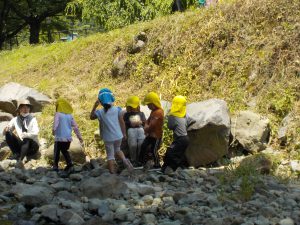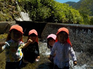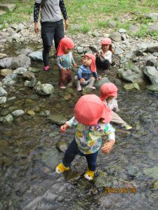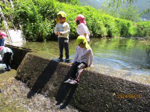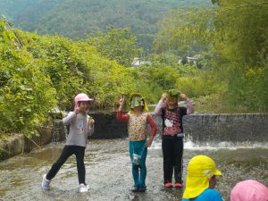 ・年少、年中児は、水で思い切りぬれたり、木や葉っぱを使って魚釣りをしたり、体が冷えて体を温める方法を知ったりしながら、友達と一緒に遊びを広げている。自分達のやりたい遊びを見つけたり、年長児の面白い遊びのアイディアにも触れたりしながら、川で遊ぶ楽しさや面白さを感じられるようにしている。