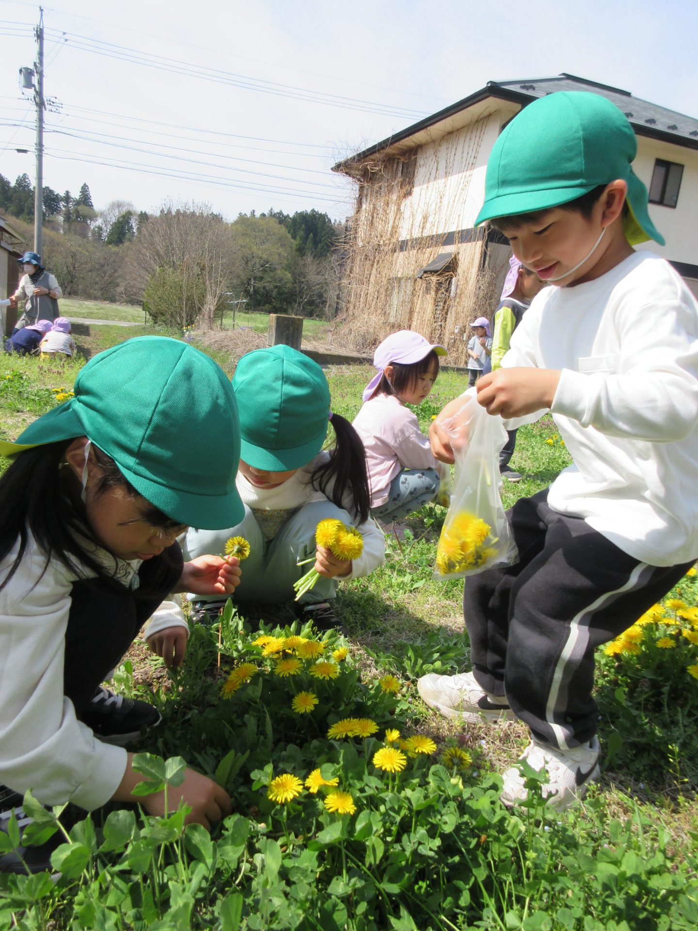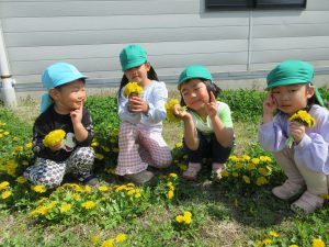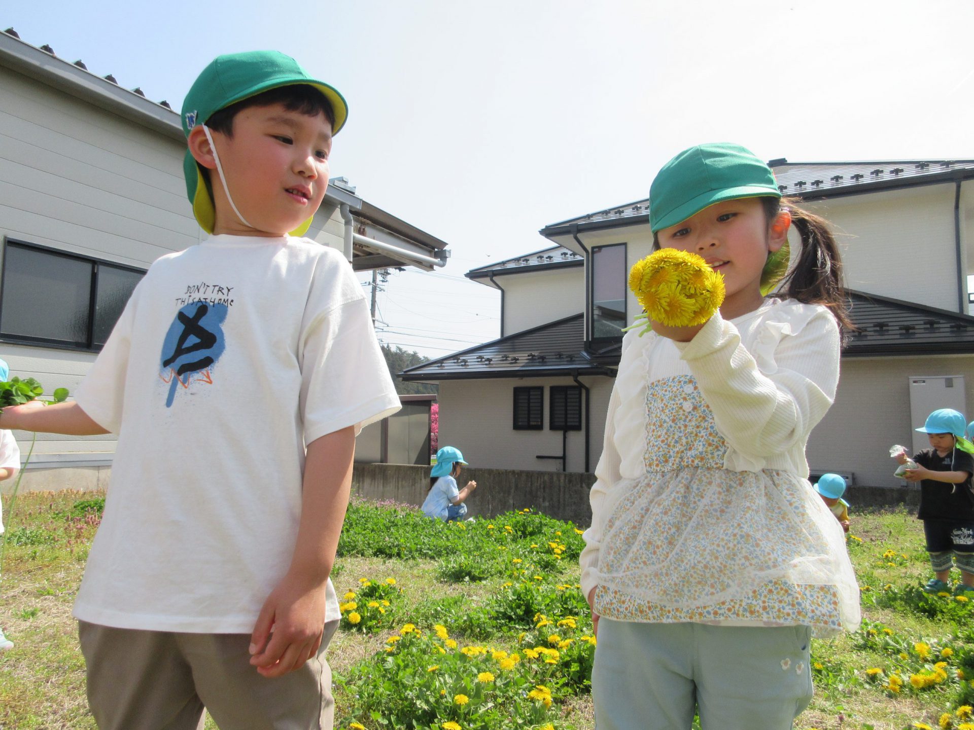 ・季節の移り変わりを、咲いている花など身近な植物で感じたようでした。たんぽぽ、クローバーなどを摘んだり、シロツメ草で時計を作ったり草花遊びに発展する姿が見られました。花の名前を友だちと教え合ったり自分より年下の子に摘んであげたり、自然に触れながら戸外での活動を楽しんでいました。