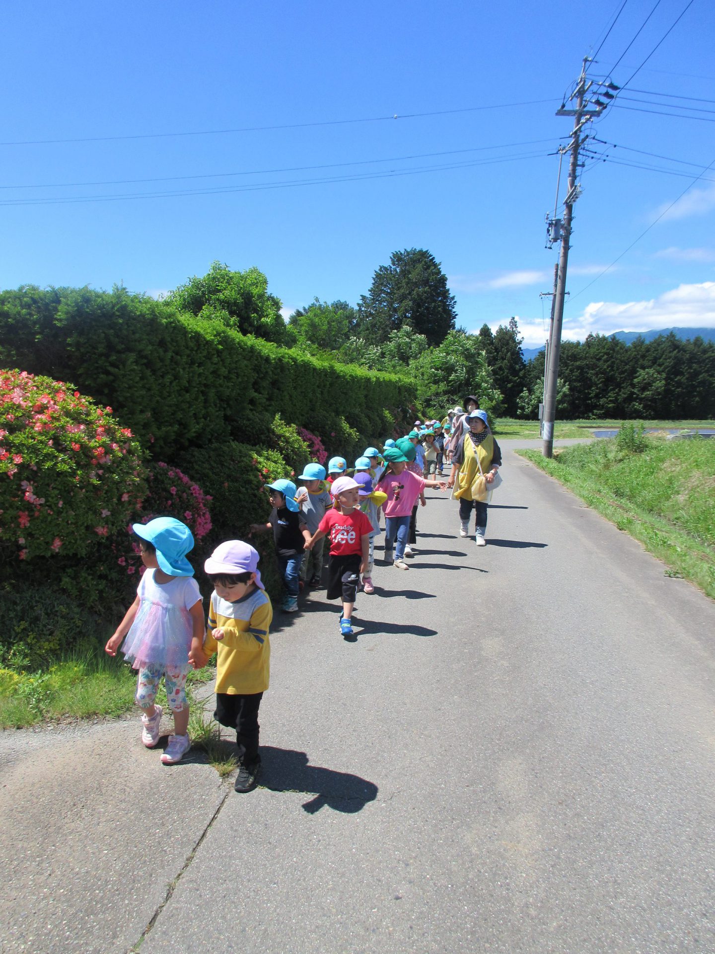 ・年少児は入園して間もない時期でしたが、お姉さん、お兄さんと一緒に歩き目的地に着くとのびのびと遊んでいました。