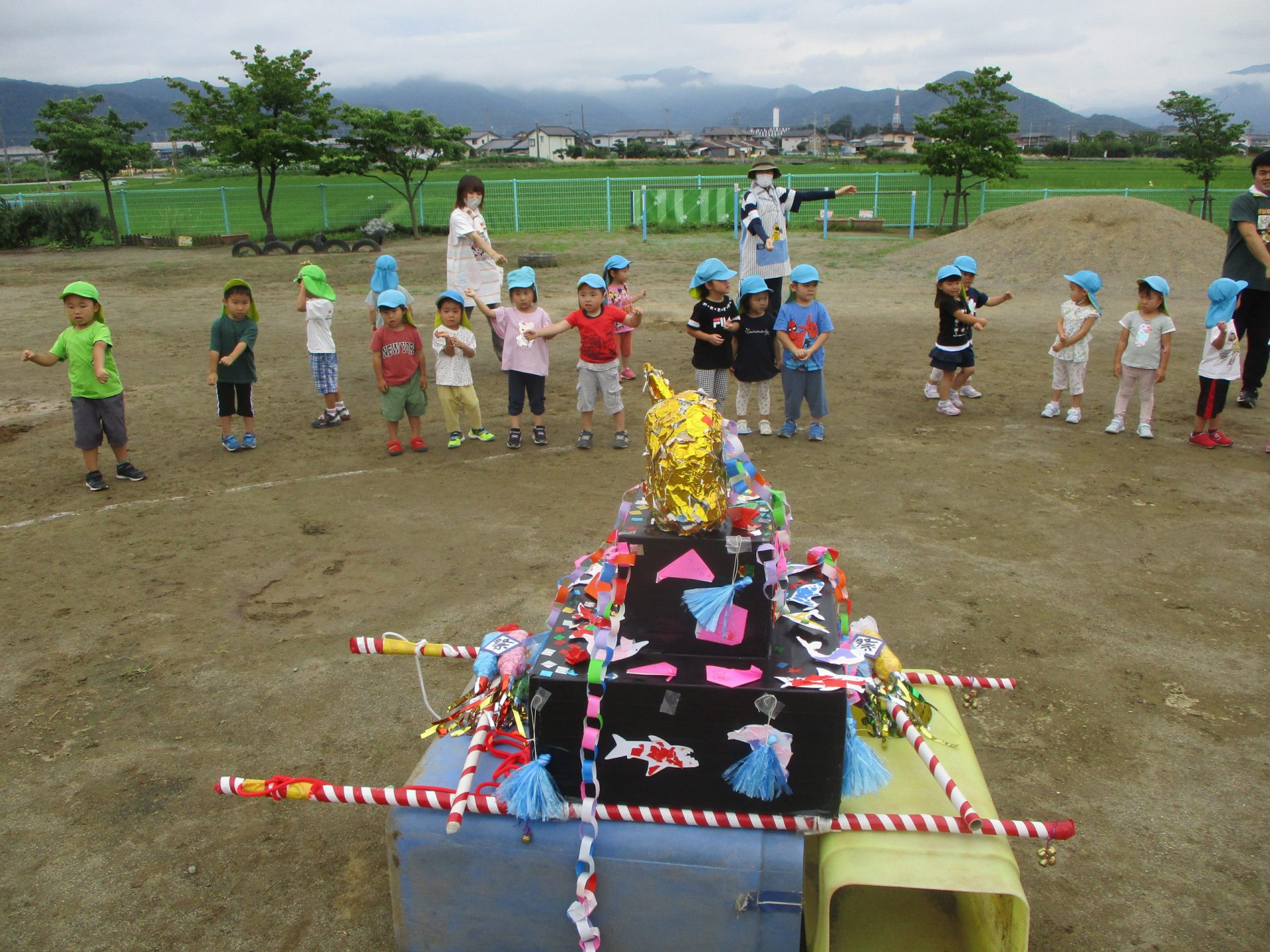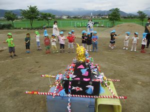 園庭ではおみこしを囲んで盆踊りです。