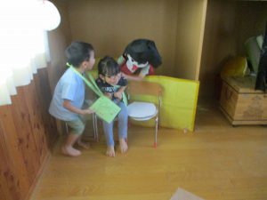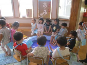 この日は年中・年少児が当番をし、年長児がコーナーをまわります。